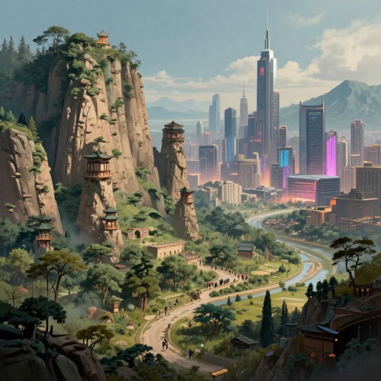 Digital art blending ancient mountainous landscape with traditional pagodas into a futuristic modern city skyline with skyscrapers and vibrant neon lights. The scene showcases dynamic lighting and an extended horizon featuring a winding river, lush greenery, and contrasting elements of history and technology.