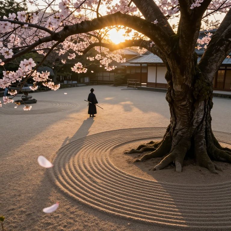 Imagine an enchanting Zen garden, nestled within an ancient tree trunk, captured from a unique aerial perspective. The golden light of sunset filters through the twisted branches, highlighting the meticulously raked sand patterns. In the foreground, a cherry blossom petal gracefully descends, while in the background, a solitary samurai stands motionless, his shadow stretching across the peaceful scene. This captivating panorama seamlessly blends the serenity of traditional Japanese aesthetics with dramatic sunset lighting, evoking a sense of calm and solitude amidst nature's grandeur. The interplay between light and shadow, as well as the juxtaposition of the ancient tree and the samurai warrior, adds depth and intrigue to this mesmerizing view.