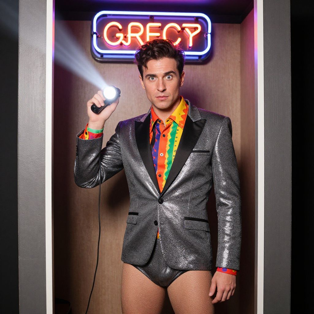 A man in a shiny, bell-bottomed suit and a colorful shirt, holding a disco flashlight, posing in a retro-style photo booth with a vintage neon sign in the background.