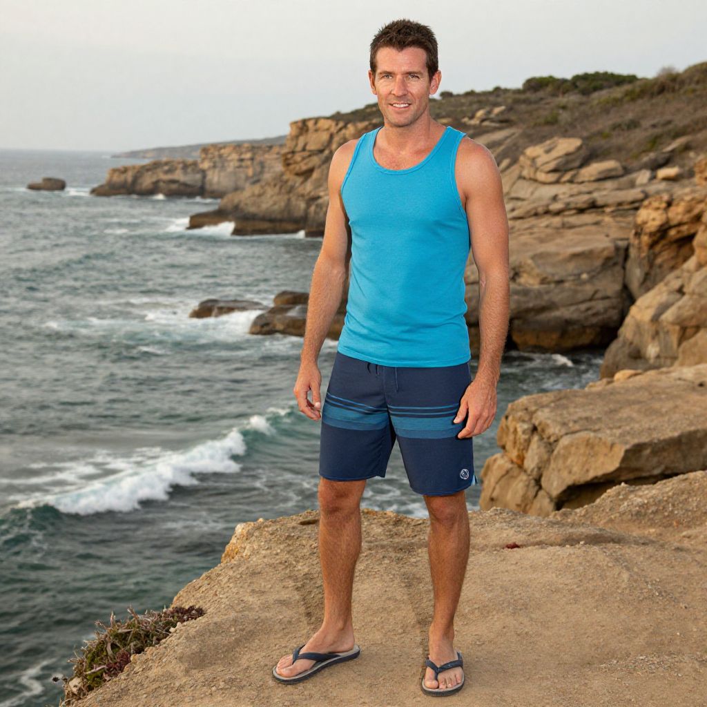 A man, athletic tank in bright blue, quick-dry board shorts in navy, lightweight flip-flops, coastal cliffs, ocean breeze, rugged shoreline, hand-tinted photograph, relaxed smile, carefree vibe. Man has masculine face and piercing eyes
