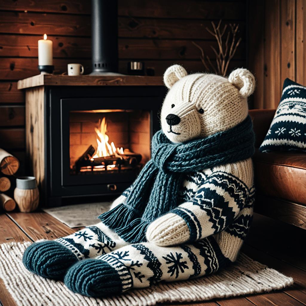 Cozy interior of a rustic wooden cabin featuring a large knitted bear figure dressed in a dark gray knitted sweater and a cream-colored knitted scarf. The bear is seated on a knitted mat in front of a glowing fireplace with wooden logs. The cabin is decorated with a wreath and small white bear figurines on the wooden mantel, creating a warm and inviting atmosphere.