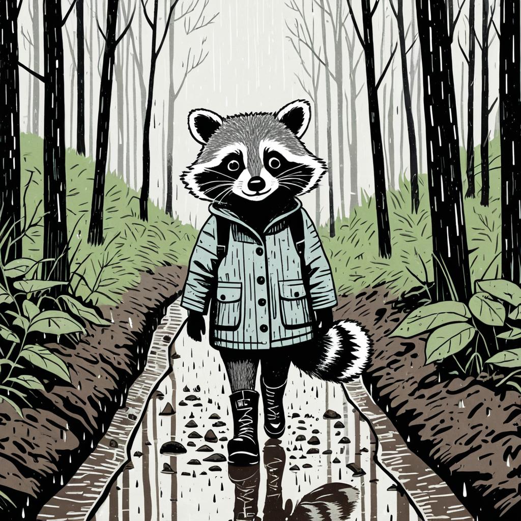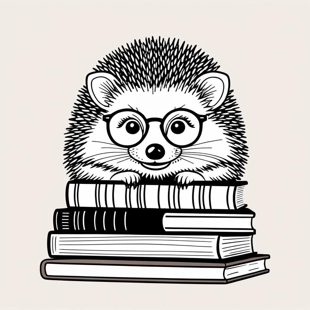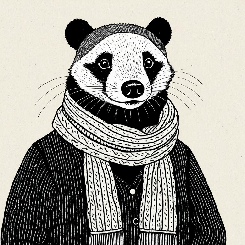 Artwork inspired by the style of Gemma Correll, featuring a sleepy bear in a knitted scarf, a rustic cabin with a glowing fireplace, minimalist line art with humorous details