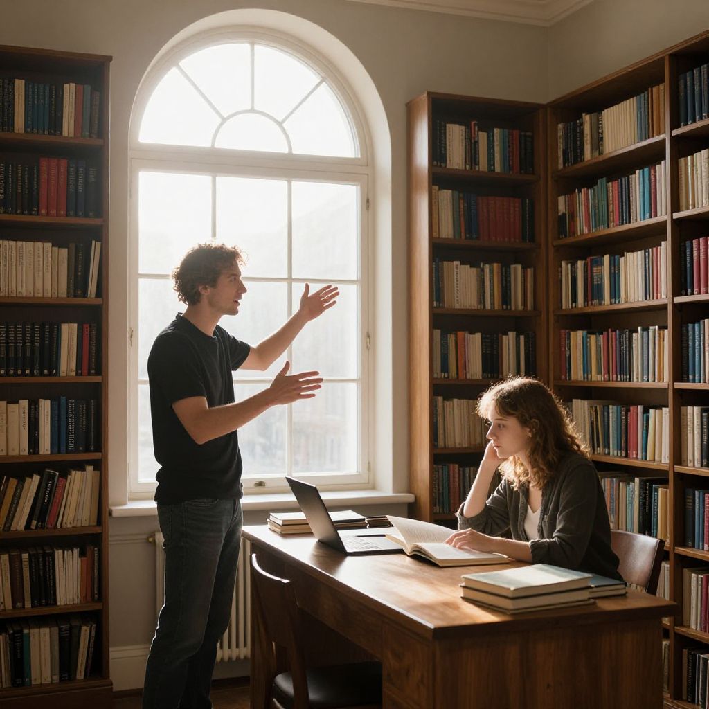 Photograph of a sunlit library room with a tall arched window in the background. A curly-haired man in a black t-shirt and jeans stands on the left, gesturing animatedly with his hands. A long-haired woman in a gray cardigan sits at a wooden table on the right, looking up at him with a focused expression. She's using a laptop, with several books stacked beside it. The room is filled with bookshelves on both sides, filled with various colored books. The light from the window casts a warm glow, creating a contrast between the bright window and the darker shelves.