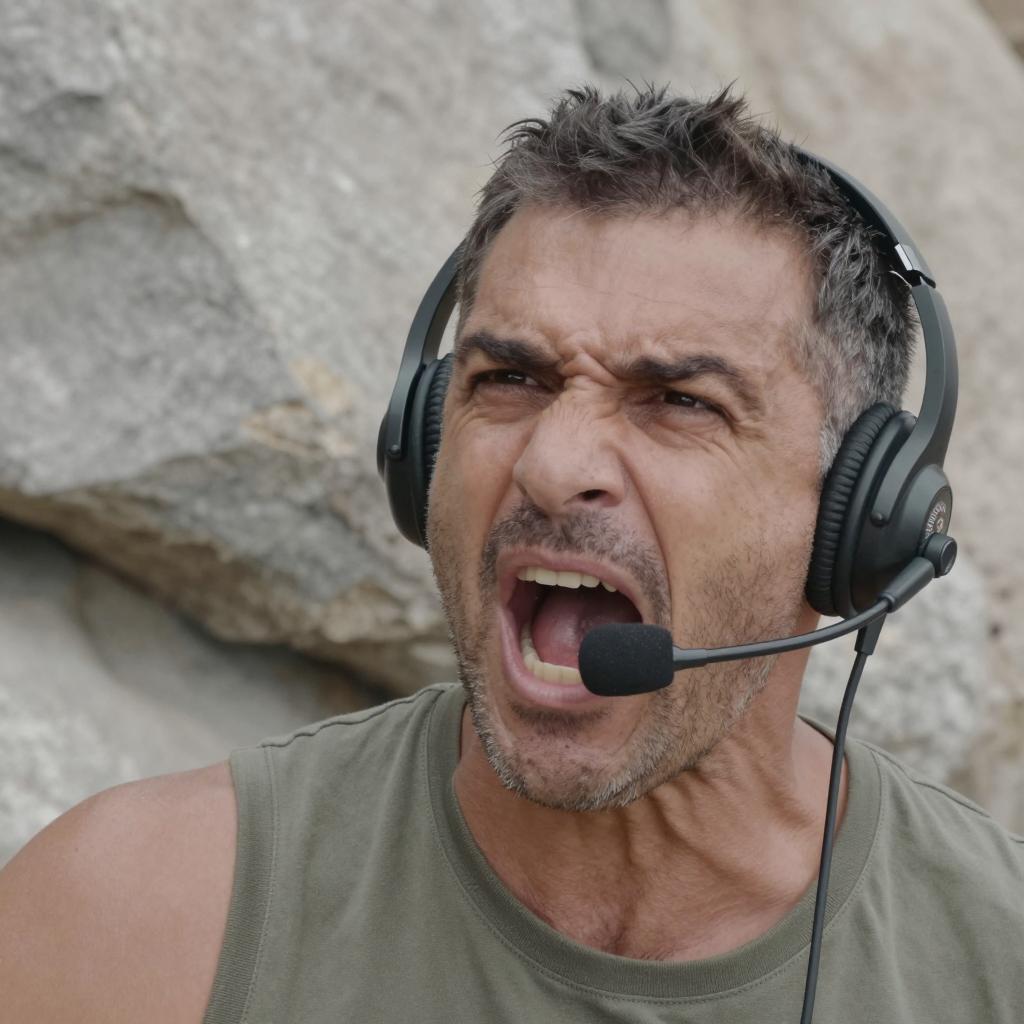 Middle-aged man with graying, curly hair, wearing a green shirt, holding a black rotary phone to his ear with his right hand, left hand raised in a gesture. Background includes green and red vertical panels. Man's face shows a concentrated expression.
