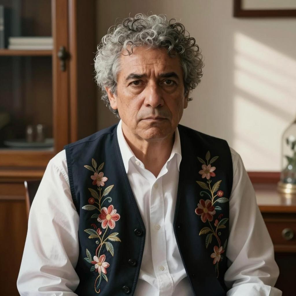 Portrait of a middle-aged man with graying curly hair wearing a green button-up shirt, holding a black rotary phone to his ear with his right hand, while his left hand is raised in a gesturing manner. The background features green and red vertical panels. The man has a concentrated and serious expression.