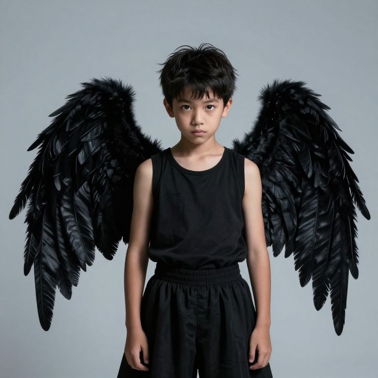 Photograph of an Asian boy with short black hair, wearing a black sleeveless shirt and pants, standing with large black feather wings against a light blue