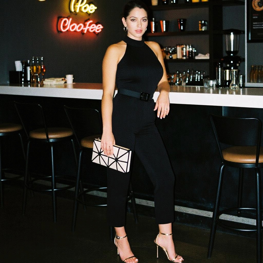 Photograph of a confident woman with dark hair in a high bun, wearing a shimmering gold halter jumpsuit and black strappy heels, standing