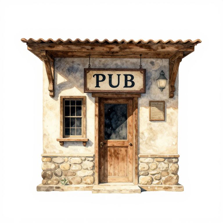 Watercolor-style drawing of a rustic stone pub with a wooden door, "PUB" sign, window, lantern, and stone base.