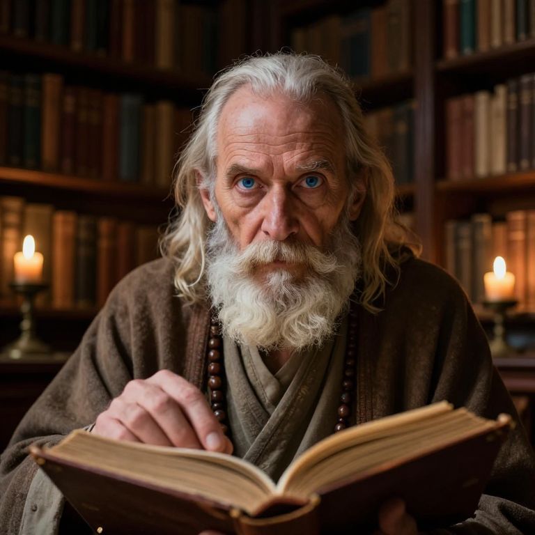 Photograph of an elderly white man with long, wavy white hair and a full white beard, sitting in a dimly lit library. He has piercing blue eyes and is intently staring at an open book he holds with his right hand. He wears a brown, textured robe with wooden beads draped around his neck. The background features dark wooden bookshelves filled with books, and two lit candles on the left side, casting a warm glow. The overall mood is mystical and scholarly, with a focus on the man's intense, wise expression.
