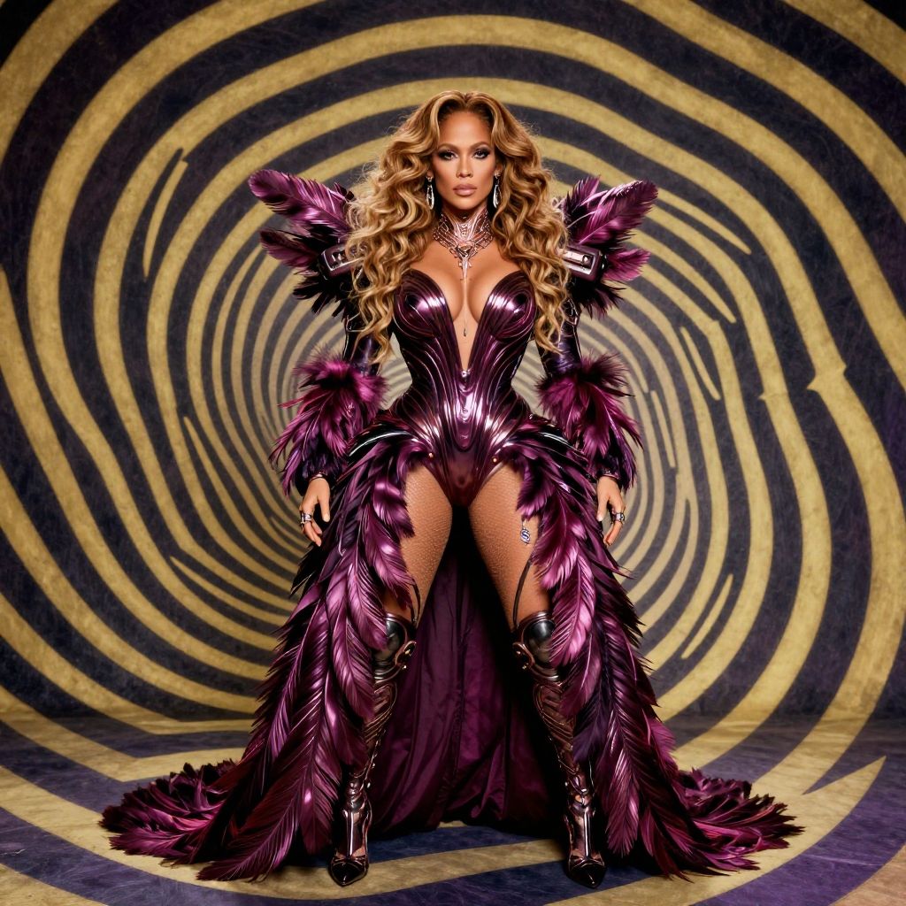 Full body, Jennifer Lopez, Photography, photo, cinematic, funny alien evil cybernetic doll, glossy plumage, intricate feather patterns, vintage sci-fi, popart, conceptual, groove, hypnotic, surreal, fashion, visually striking image, pop art --ar 4:5 --s 50 --v 6.0