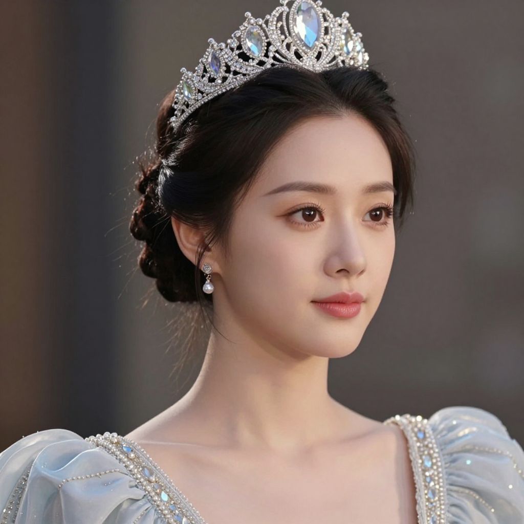 Photograph of an Asian woman with fair skin, black hair in an elegant updo, wearing a sparkling silver tiara, diamond earrings, and a