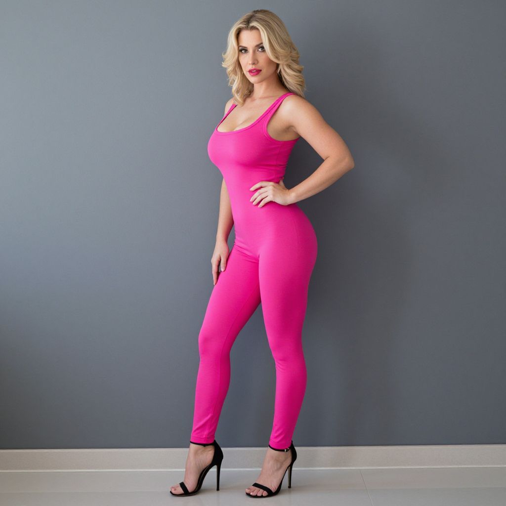 Photograph of a blonde woman standing against a plain gray wall. She's wearing a bright pink, sleeveless jumpsuit that fits snugly, highlighting her curvy figure and medium-sized breasts. Her wavy hair is styled down, and she's wearing red lipstick and black high-heeled sandals. Her right hand is on her hip, and she's looking directly at the camera with a confident expression. The floor is light gray.