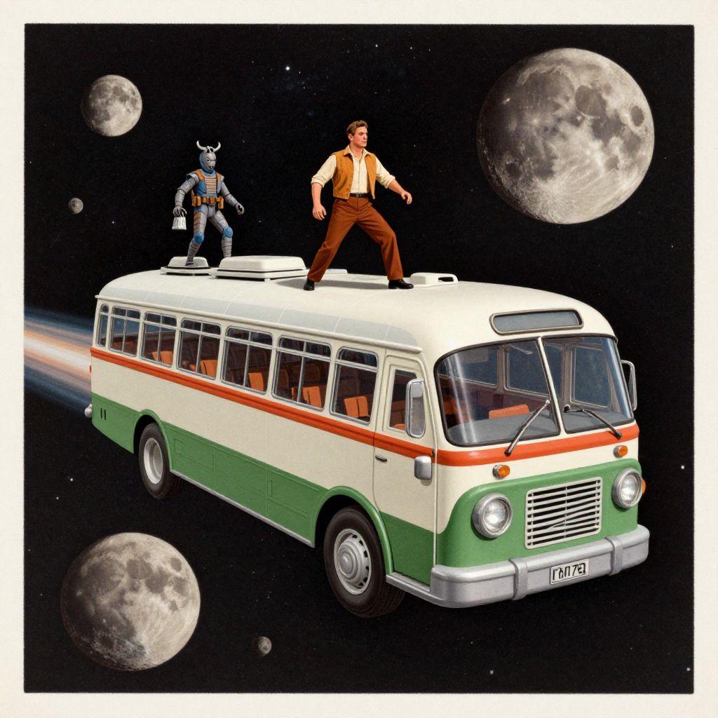 Cogs science fiction bus, flying through space, 1950s style trading card, a man is standing on top of the bus defending it from enemies, moons in the background, epic style,