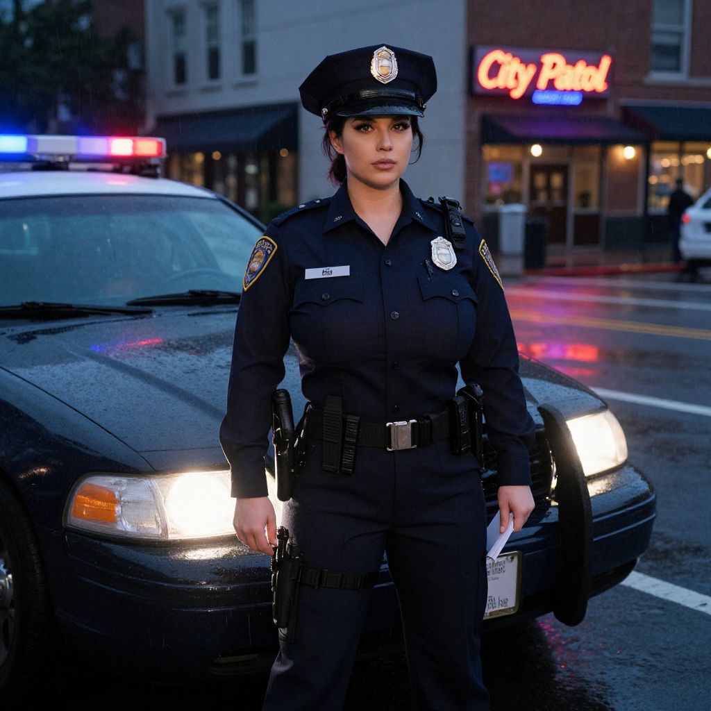 A naturalistic portrait of a police woman in a traditional police jumpsuit, standing beside a patrol car in a rainy evening at a city intersection, her face lit by the headlights of the car, her expression calm and professional, wearing a small police hat and holding a notepad, the scene lit by a neon sign that reads 'City Patrol,' creating a moody atmosphere.. The woman has big tits and cute face