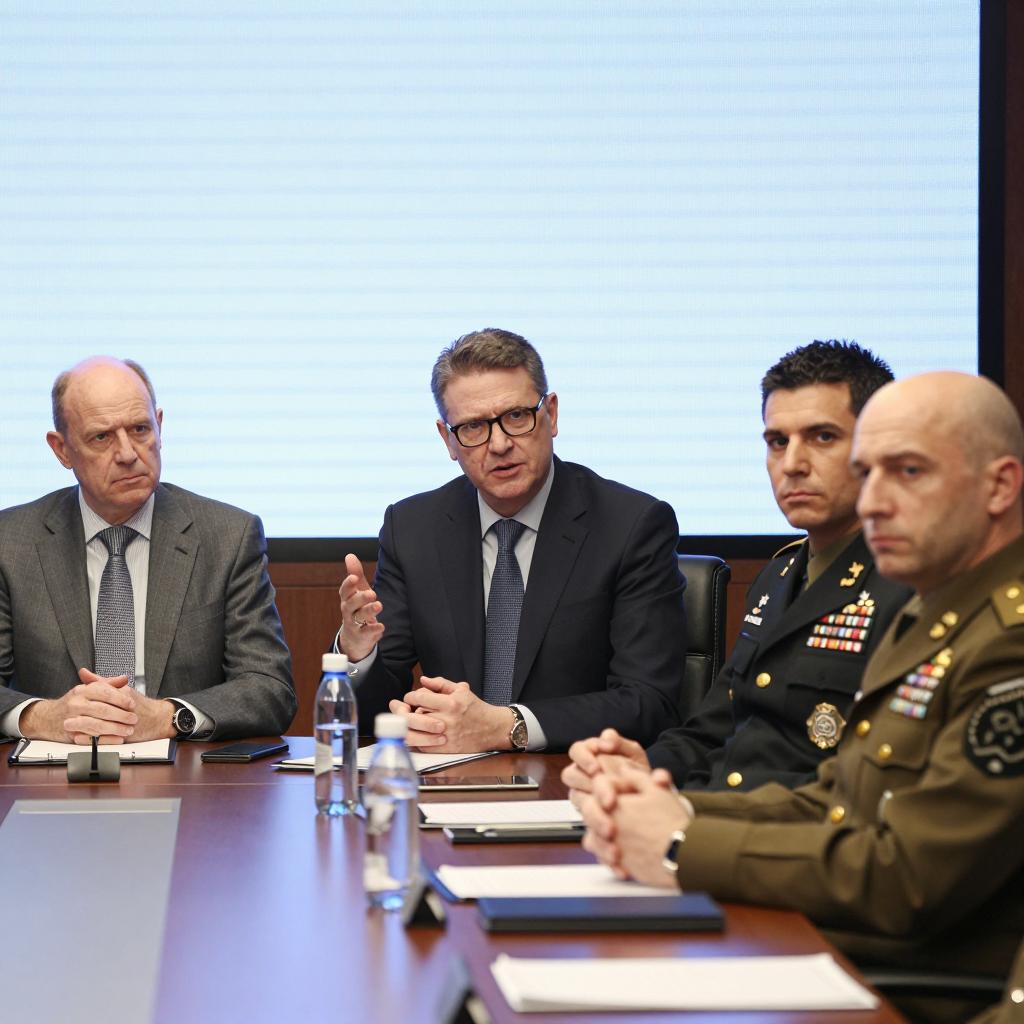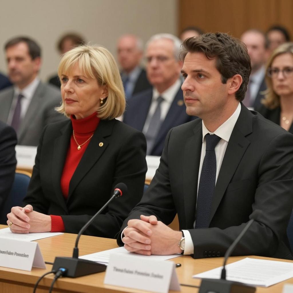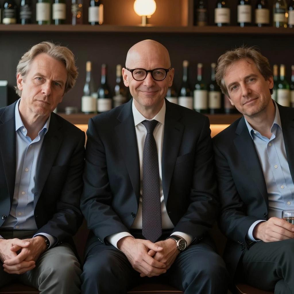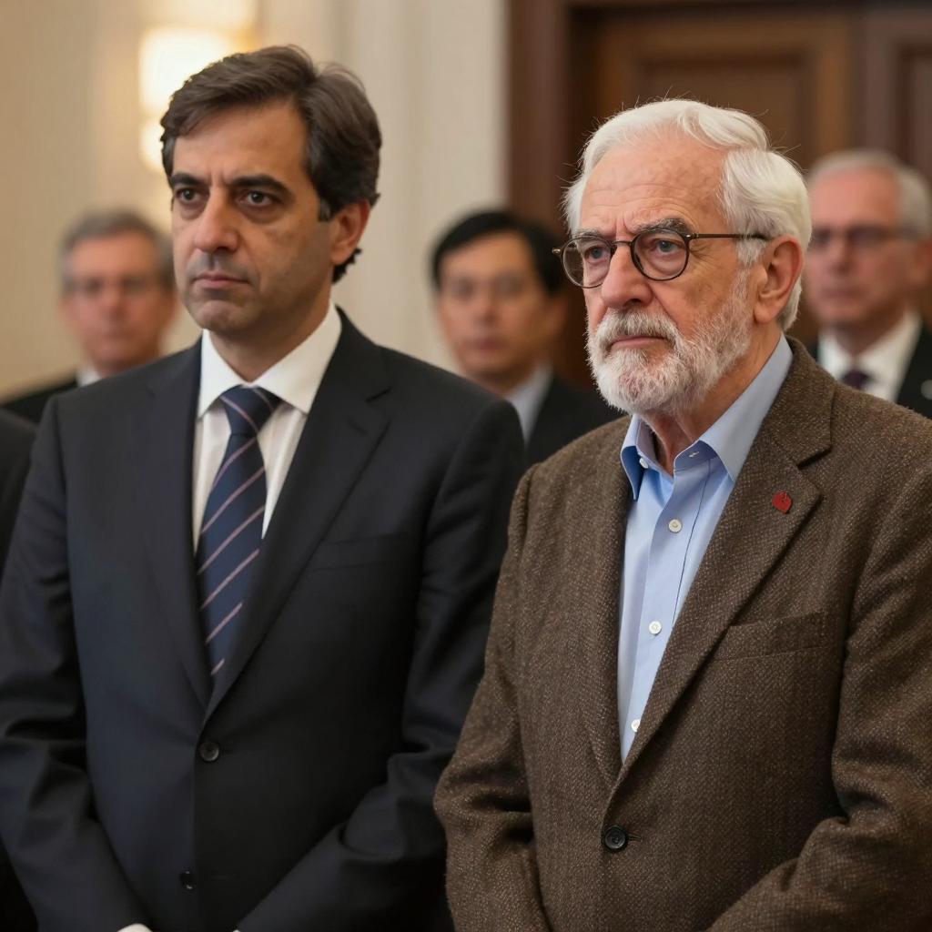 Two men in suits sit at a desk. The man on the left has glasses, a balding head, and a dark patterned jacket. The man on the right has dark hair, a white shirt, and a black tie, holding a microphone. Behind them, a wall displays clocks with city names and time zones. Three black-and-white TV screens are above the clocks. The background is a gray wall.