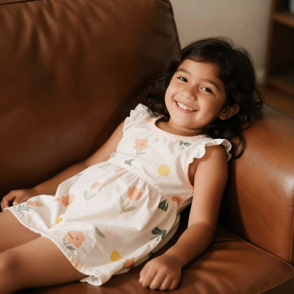 Photograph of a young girl with medium brown skin and black, wavy hair. She is smiling warmly, showing small, white teeth. She is wearing a white, sleeveless dress with a floral pattern featuring small orange, green, and yellow flowers. She is sitting on a brown leather couch with her back against the cushion and legs slightly apart. The couch occupies the left and right sides of the image, while the background is slightly blurred, showcasing a neutral-colored wall and a wooden shelf. The lighting is soft, highlighting her cheerful expression and the texture of the leather couch.
