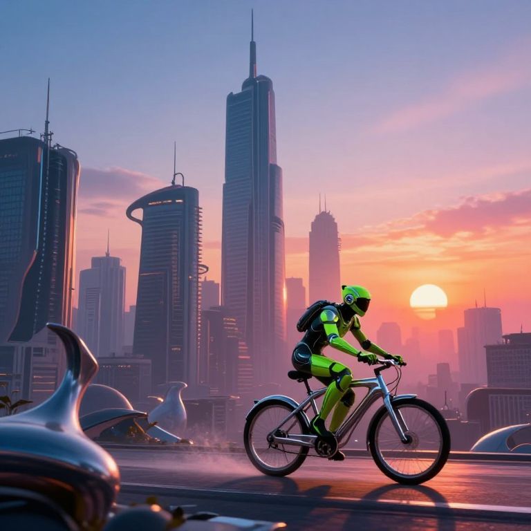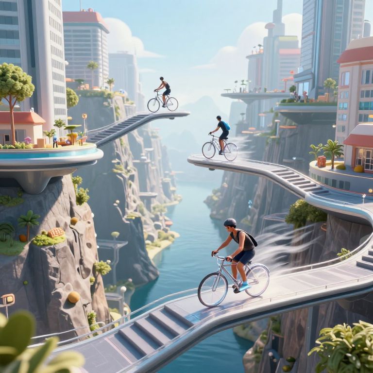 A futuristic 3D-rendered cityscape features suspended staircases connecting floating platforms above a serene canyon, where residents glide effortlessly on translucent bicycles, defying gravity and wind, evoking a cyberpunk-inspired vision of seamless urban commuting.
