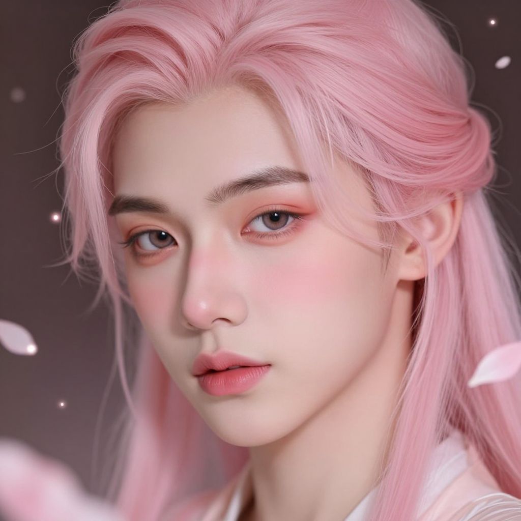 Close-up portrait of a pink femboy with soft features, pastel pink hair styled elegantly, gentle makeup with warm blush tones, surrounded by floating pink petals and glowing light orbs, ethereal and serene mood, hyper-detailed fantasy artwork.