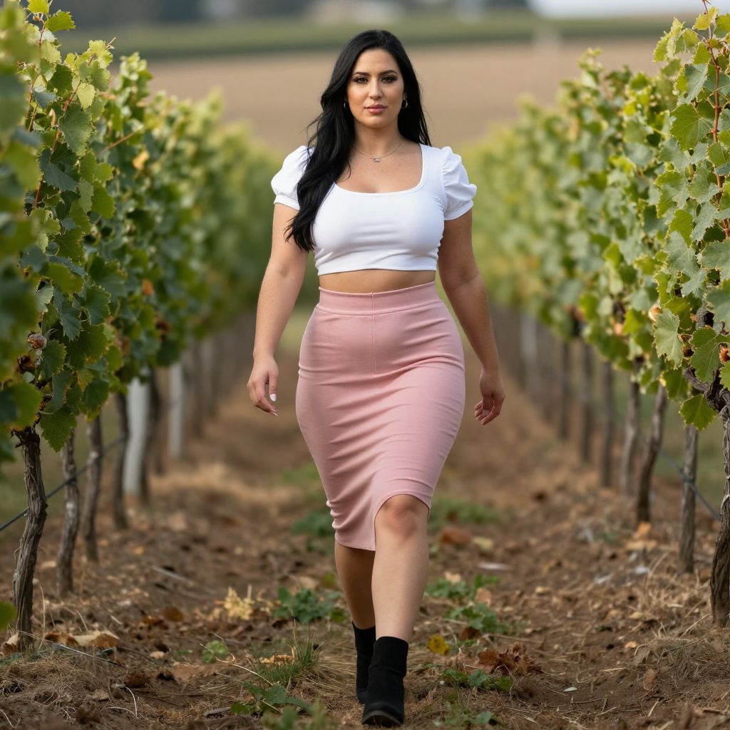Photograph of a curvy, fair-skinned woman with long, dark brown hair, wearing a white, short-sleeved crop top and a high-waisted, pale pink, knee-length skirt that fits snugly. She is also wearing black ankle boots. She is walking down a vineyard path with rows of green grapevines on both sides, under a clear sky. The background features a blurred field and distant trees, suggesting a rural setting. The ground is covered in brown soil and scattered leaves, enhancing the natural, outdoor feel. The woman's confident, relaxed posture and direct gaze at the camera convey a sense of ease and self-assurance.