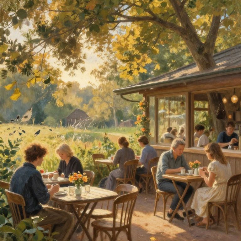 Sunlit outdoor café with wooden tables, people chatting, autumn leaves, and a rustic shed. Warm golden light filters through trees.