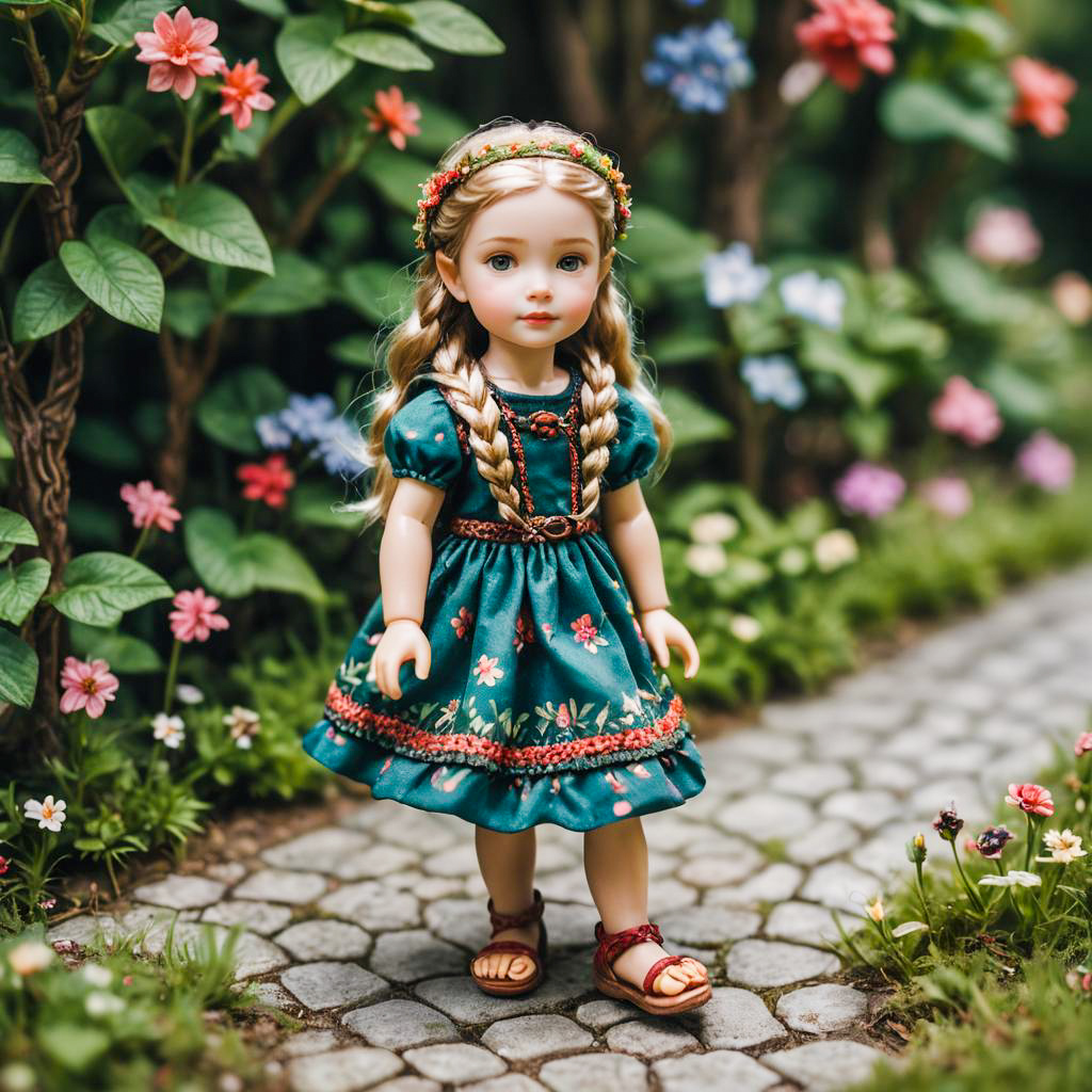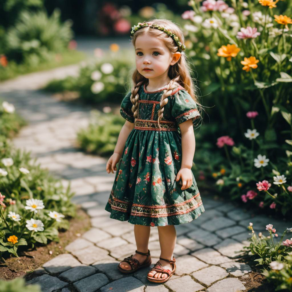 Photo of a Petite frame elf, Viking braid, Floral patterned dress and delicate sandals, tilt-shift effect
