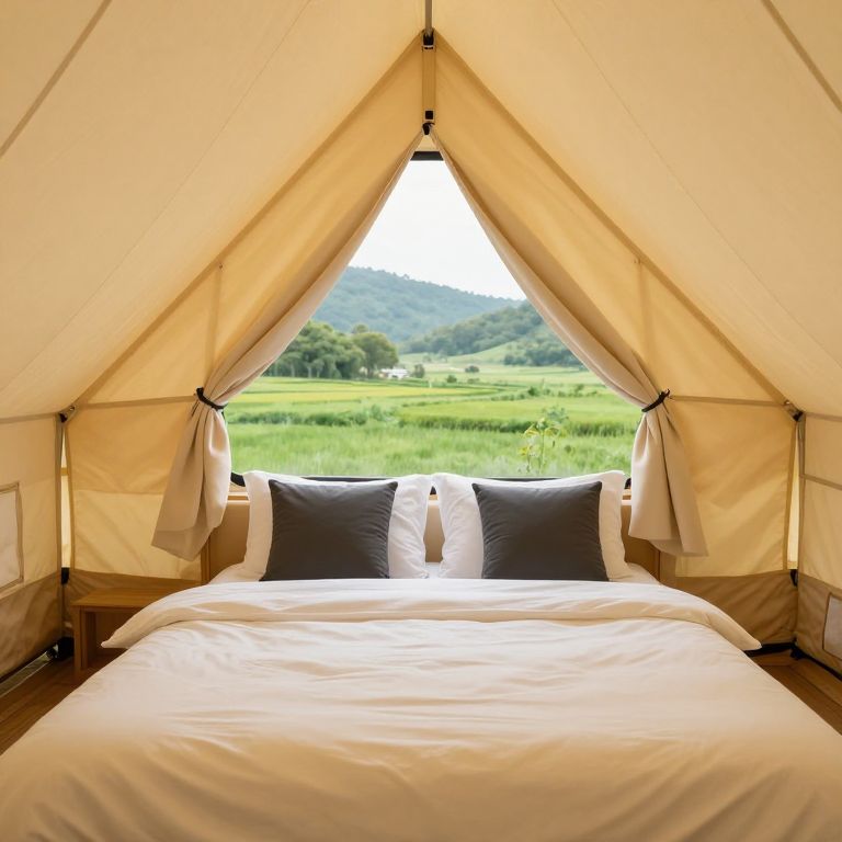 Cozy glamping interior featuring a neatly made double bed with crisp white linens and dark gray pillows, positioned beneath a large window framed by cream curtains that offer a serene view of lush green fields and distant hills, all within a warm, tent-like structure illuminated by soft yellow lighting.