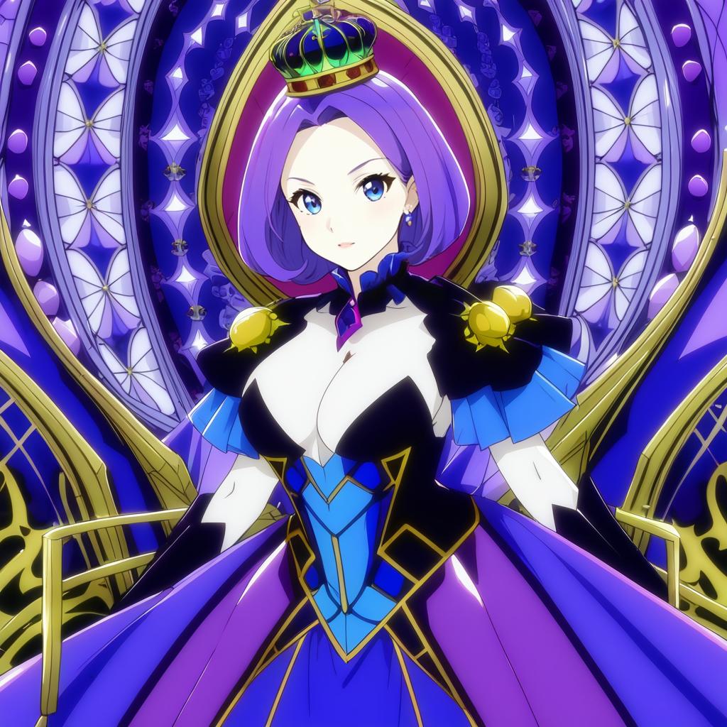 Illustration of an anime-style queen character with short purple hair and blue eyes, wearing a detailed royal outfit in shades of purple, black, and blue with gold accents. The queen is seated on an ornate throne with a large gold and green crown hovering above her head. The background features intricate patterns and purple tones, highlighting the regal atmosphere.