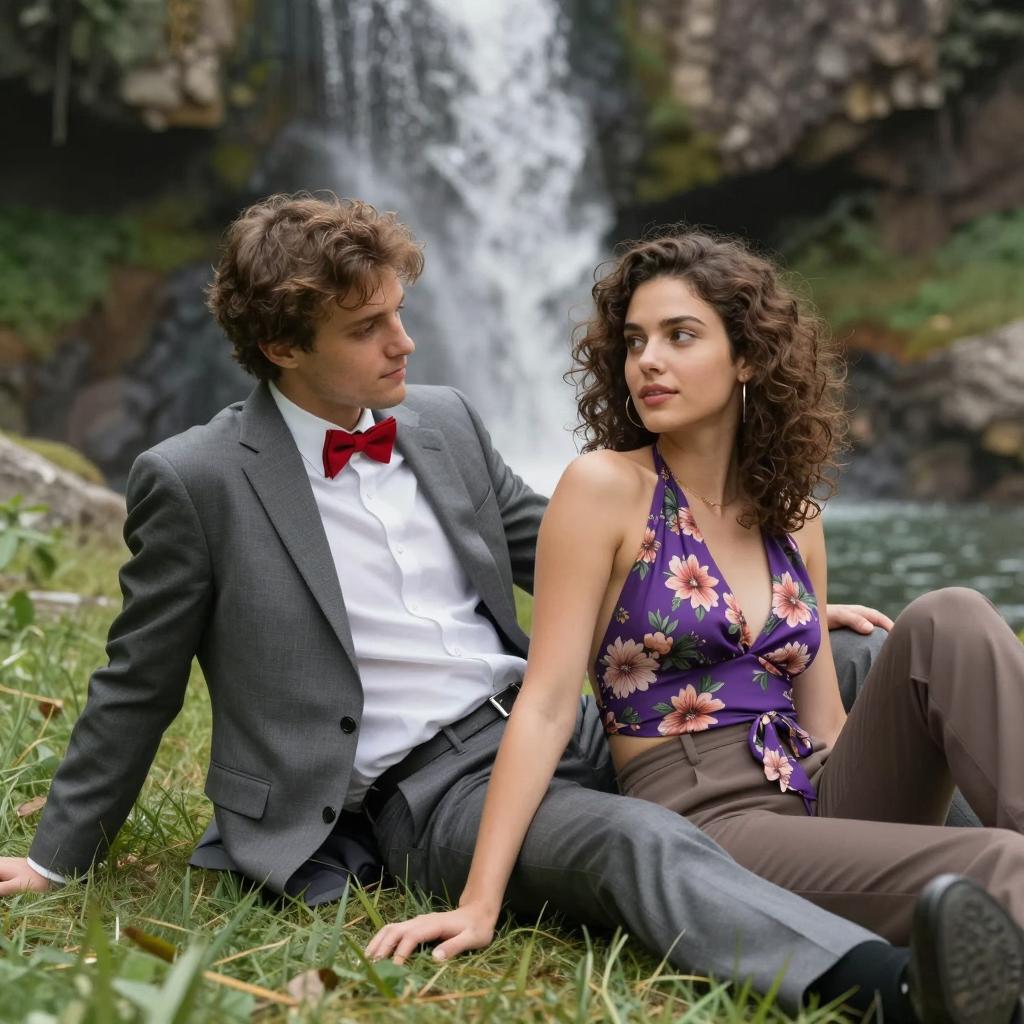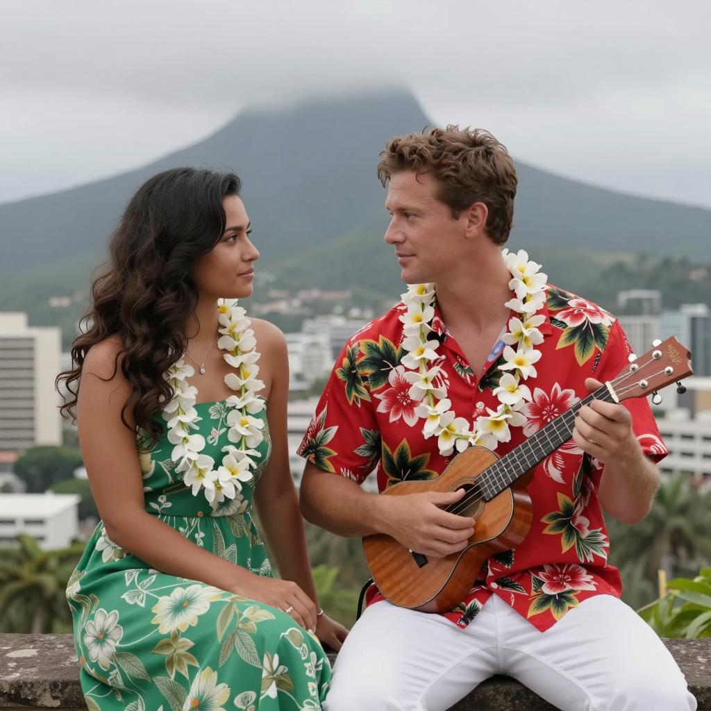 A man and woman dressed in vibrant Hawaiian clothing sit outdoors with a city and mist-covered mountain in the background. The man, wearing a red floral shirt, white pants, and a white lei, plays a ukulele while looking at the woman. The woman wears a green floral dress and a matching white lei. Both have wavy dark and short brown hair respectively, and share a moment as they gaze at each other.