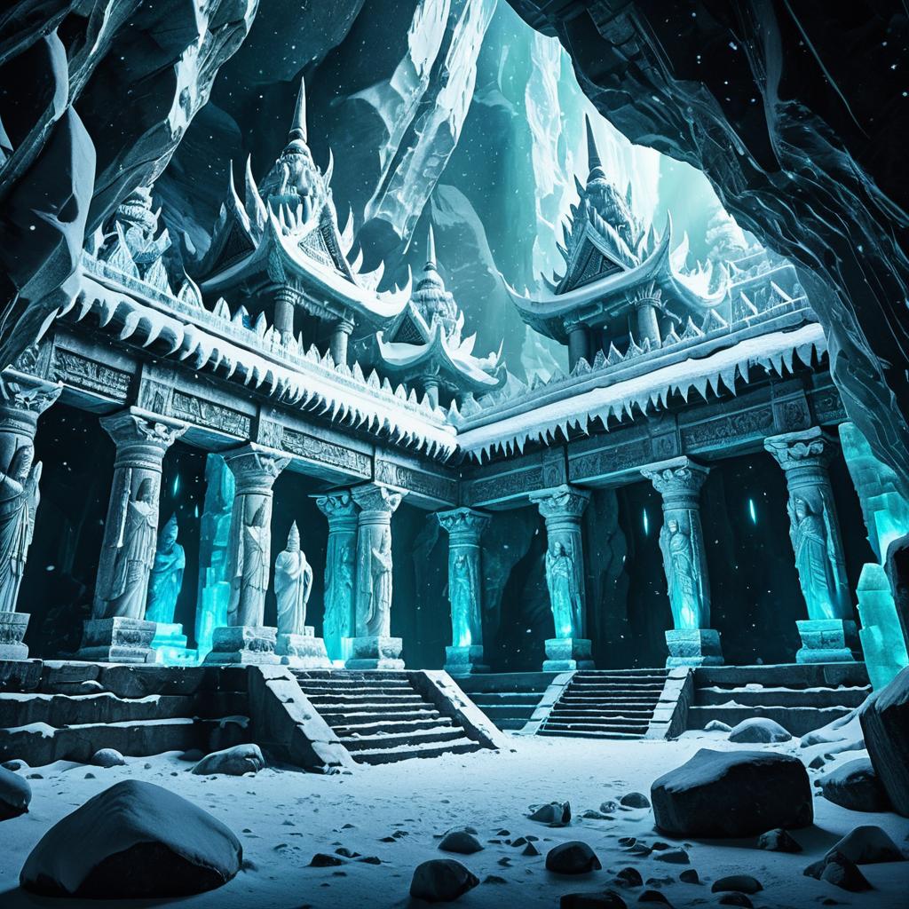 A breathtaking crystal cavern garden populated by ancient gleaming crystalline temples with carvings that shimmer in the dark, illuminated by soft ethereal glow from luminescent crystals, fantasy concept art, trending on ArtStation, cinematic, ultra-detailed visuals.