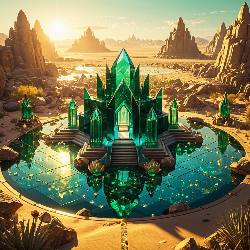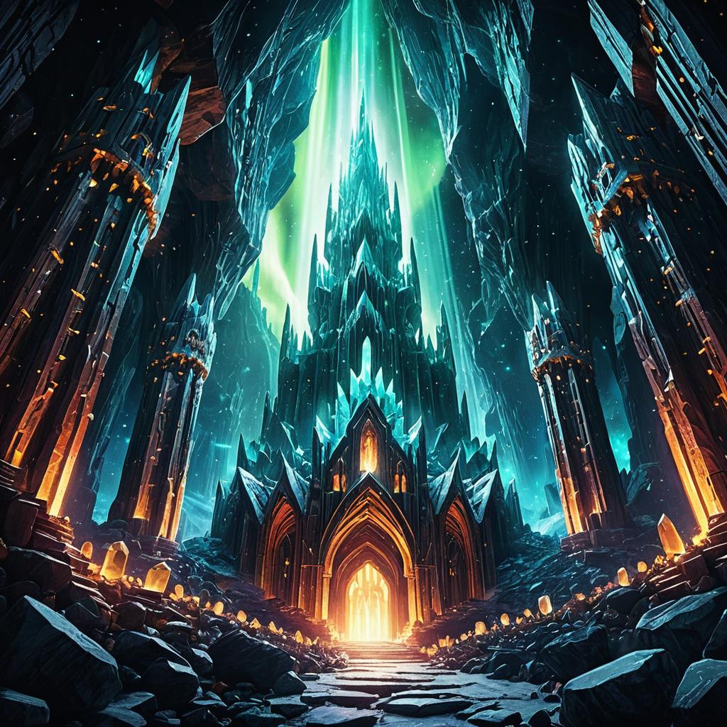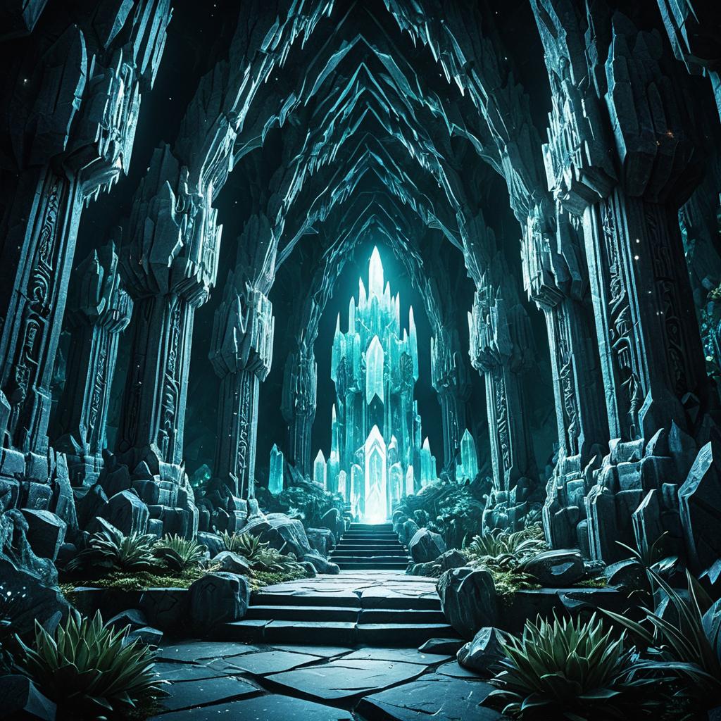A stunning fantasy scene of an ancient crystalline temple inside a cavern garden. The temple features tall, gleaming crystal spires and elaborate carvings that shimmer under a soft, ethereal glow from luminescent crystals. The path leading to the temple is made of stone steps surrounded by rugged rocks and lush green plants, creating a mystical and cinematic atmosphere.