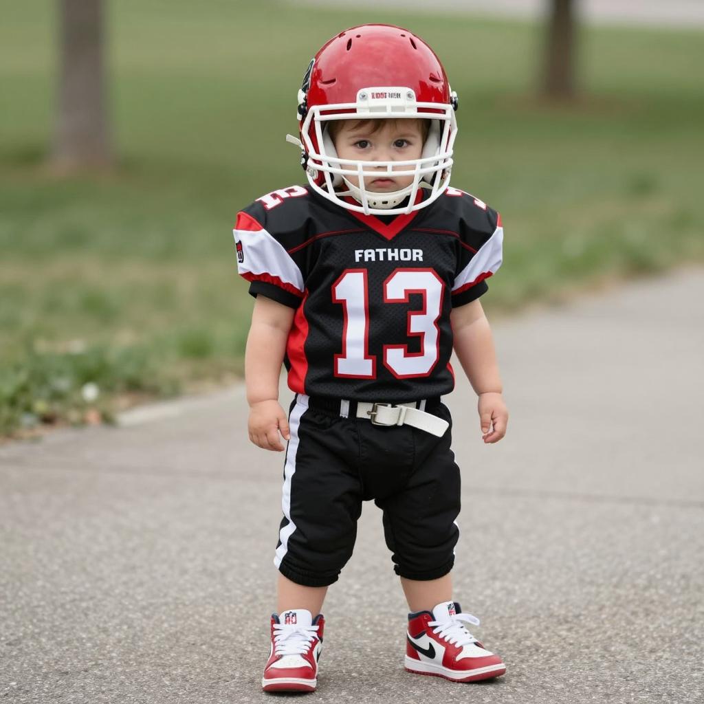 Infant football player, photograph of a toddler wearing a full NFL football uniform, number 13, standing on a paved path, daytime, outdoor setting, green blurry background, small child with brown hair, red and white helmet, black jersey with red and white accents, black pants with white stripe, white belt, red and white sneakers, serious expression, soft natural light, slight shadow on ground, realistic style, child centered, background out of focus