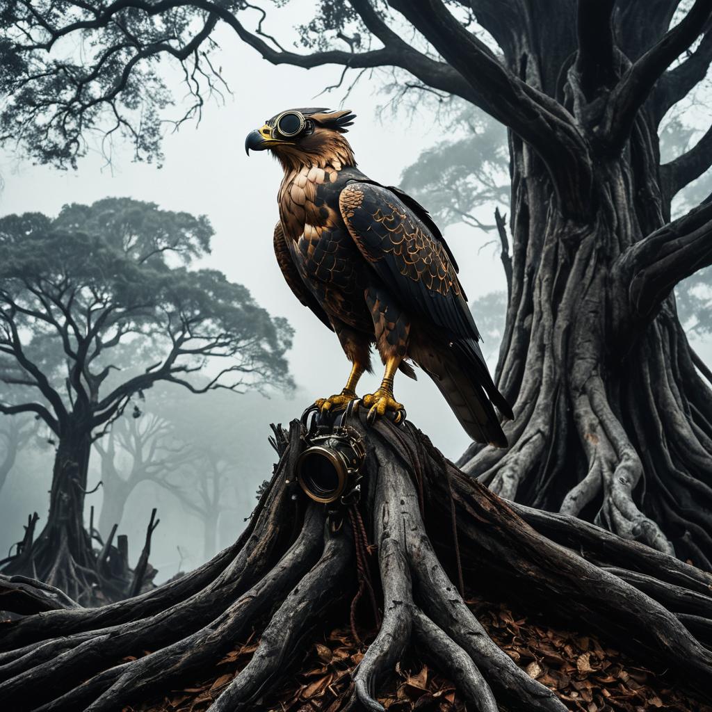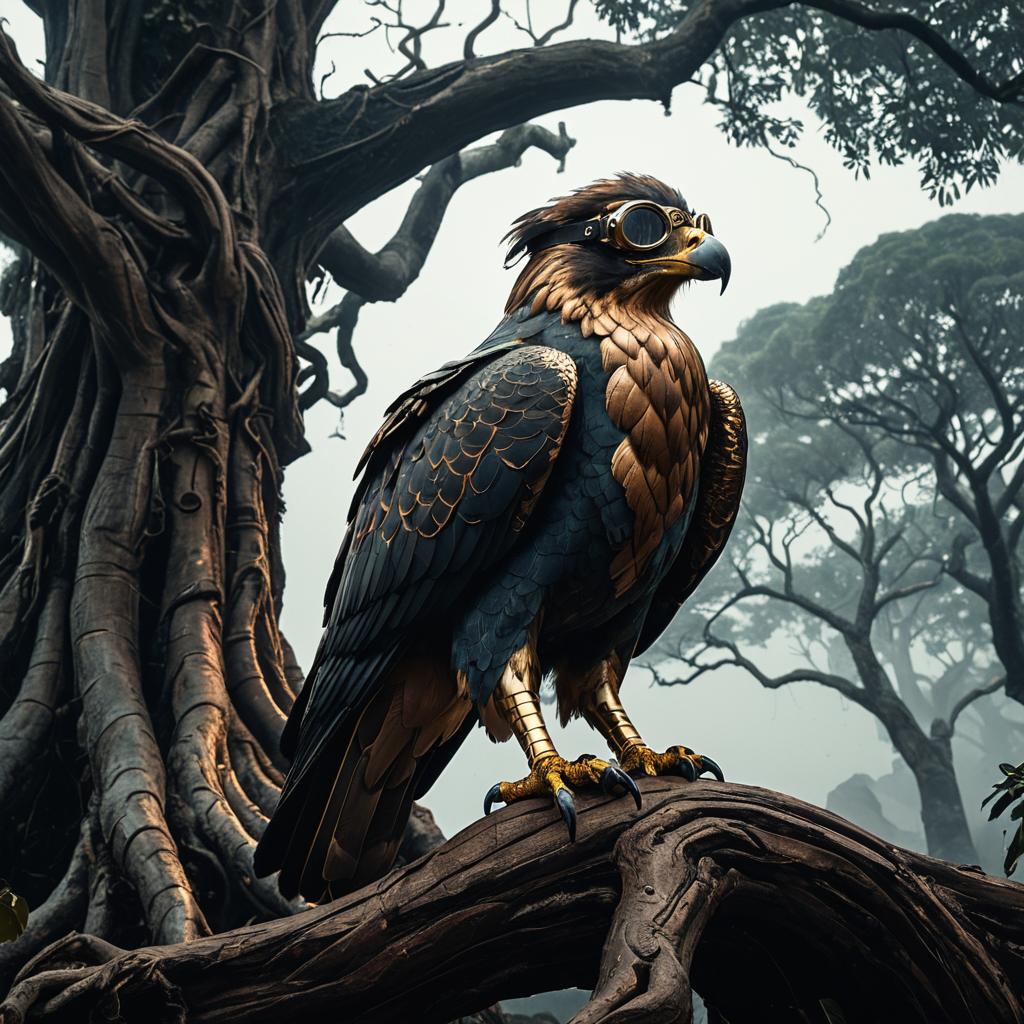 Steampunk Falcon Gryphon on Ancient Banyan Tree