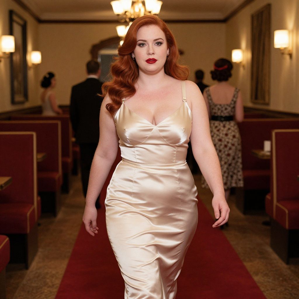 Curvy woman with fair skin and long wavy red hair walking down a red carpet in a vintage-style indoor setting. She wears a shiny, cream-colored satin dress with thin straps and a plunging neckline. The background features warmly lit booths, chandeliers, and other people dressed in vintage attire.