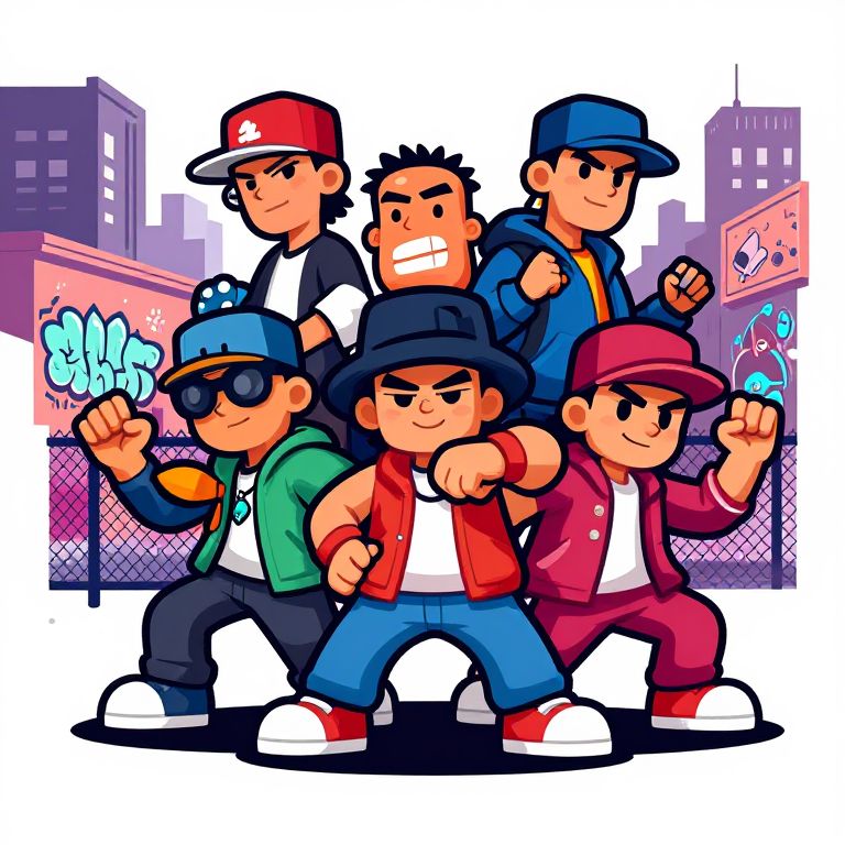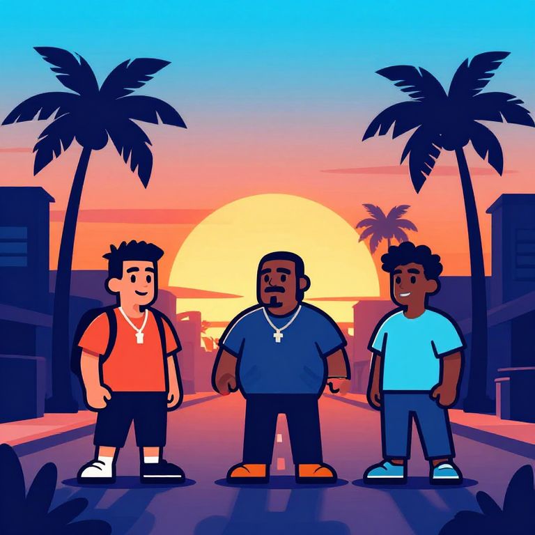 Boondocks SVG free themed scene, stylized digital vector art featuring expressive animated characters, urban street scene with palm trees and sunset gradient sky, flat color technique with emphasis on bold outlines and shadow contrast for print-ready graphic art.