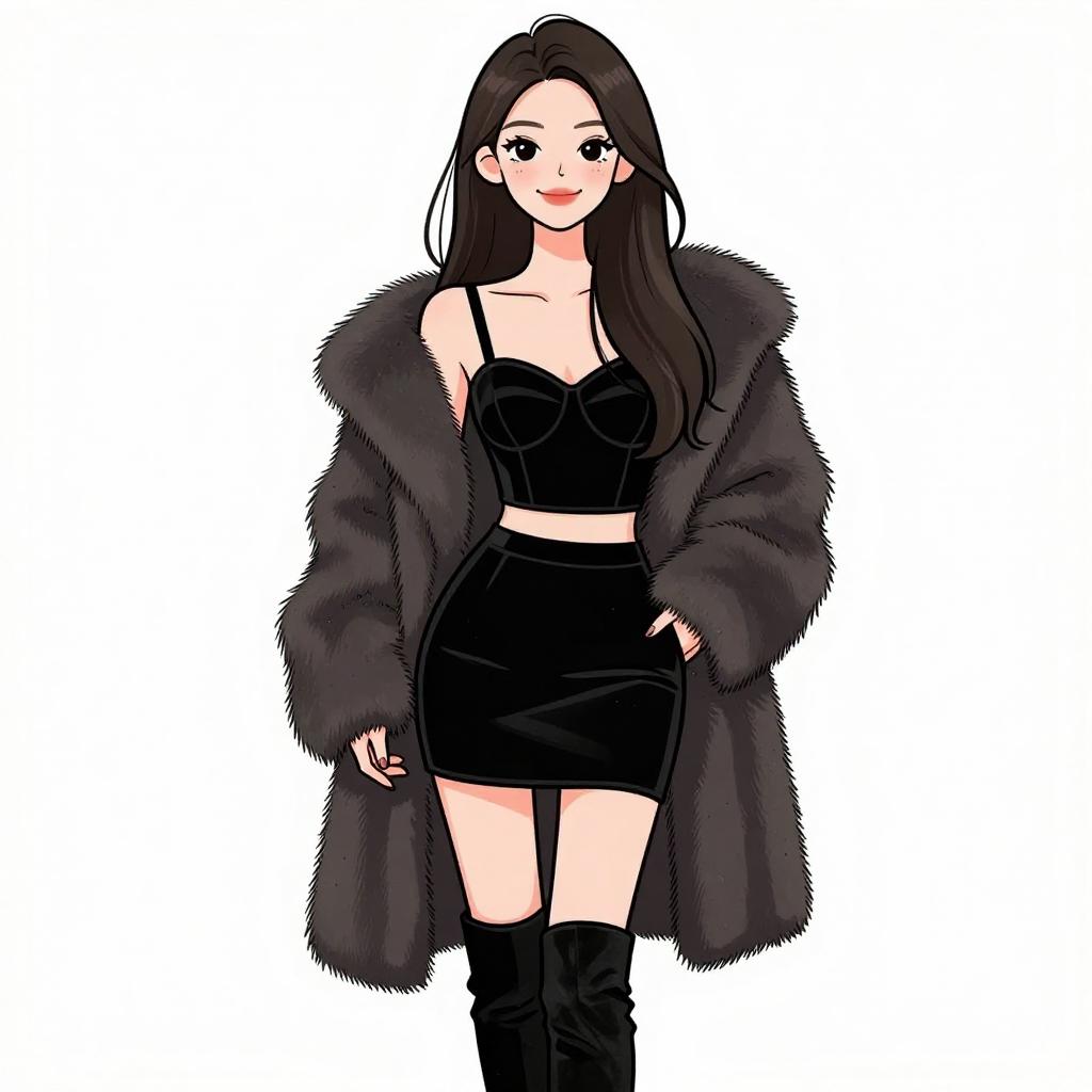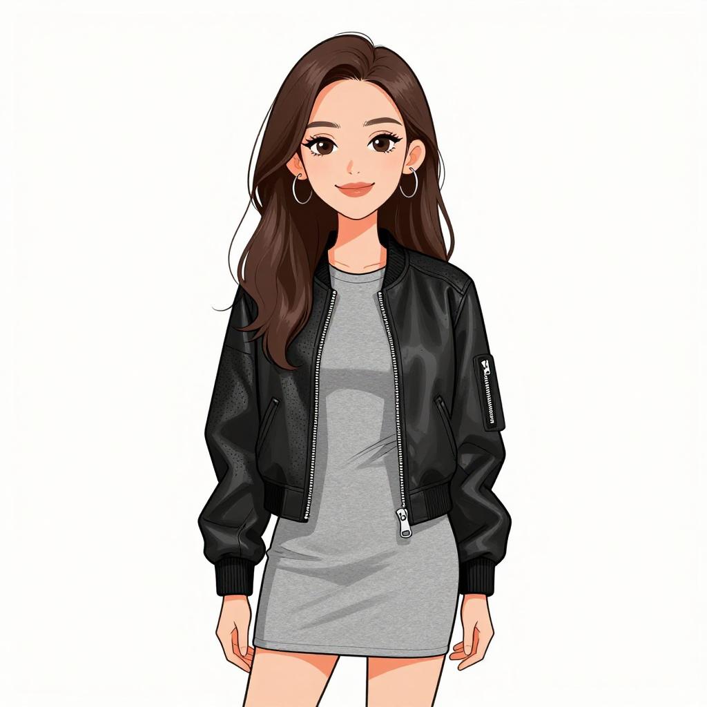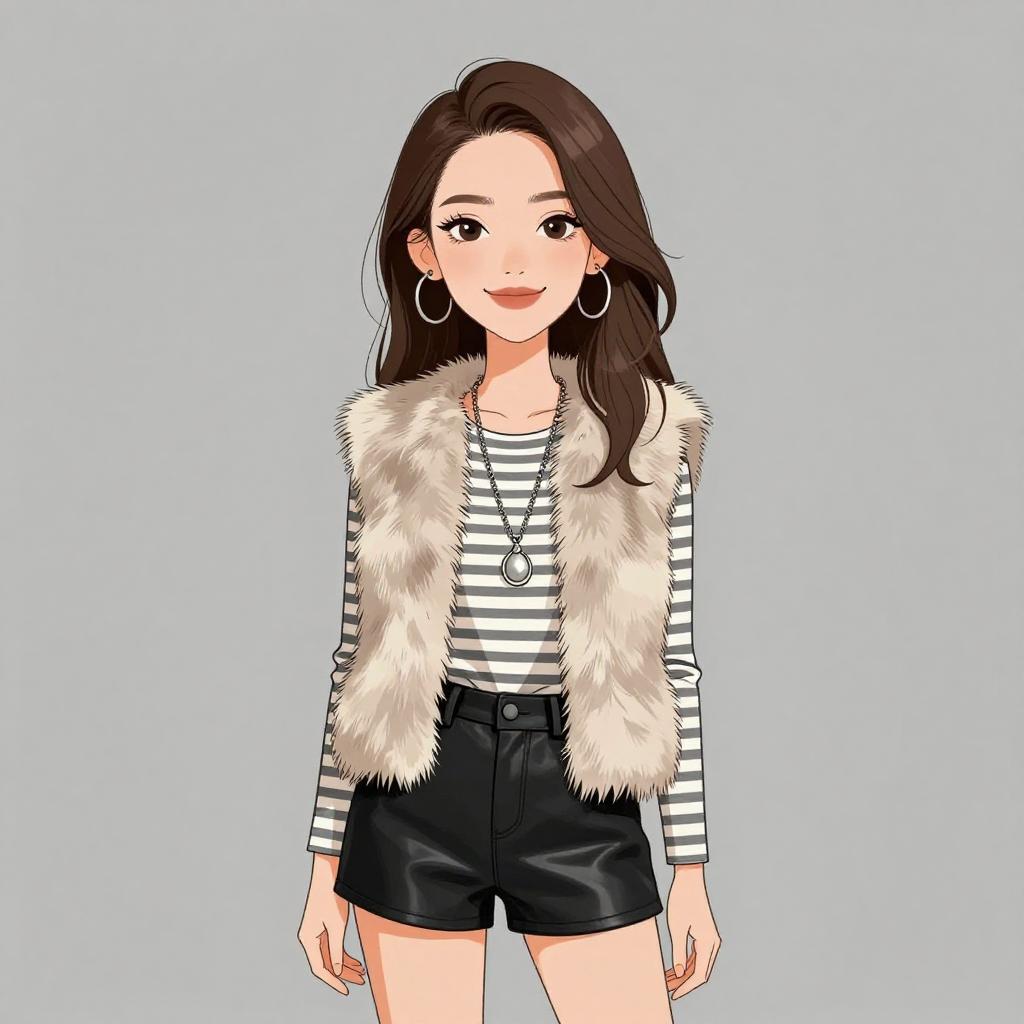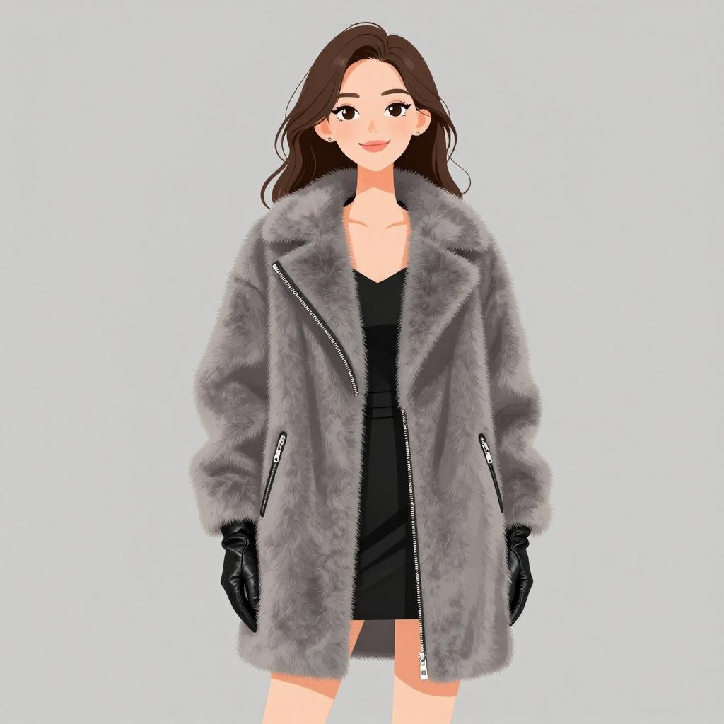 Woman with pretty face and pretty hair. smiling Woman, urban chic, oversized faux fur coat in a soft gray, leather detailing, asymmetrical front zipper, side pockets with zippers, black inner lining, knee-length, black mini dress underneath, minimal visible, finish at mid-thigh, black leather gloves, neutral studio background --sref 1467
