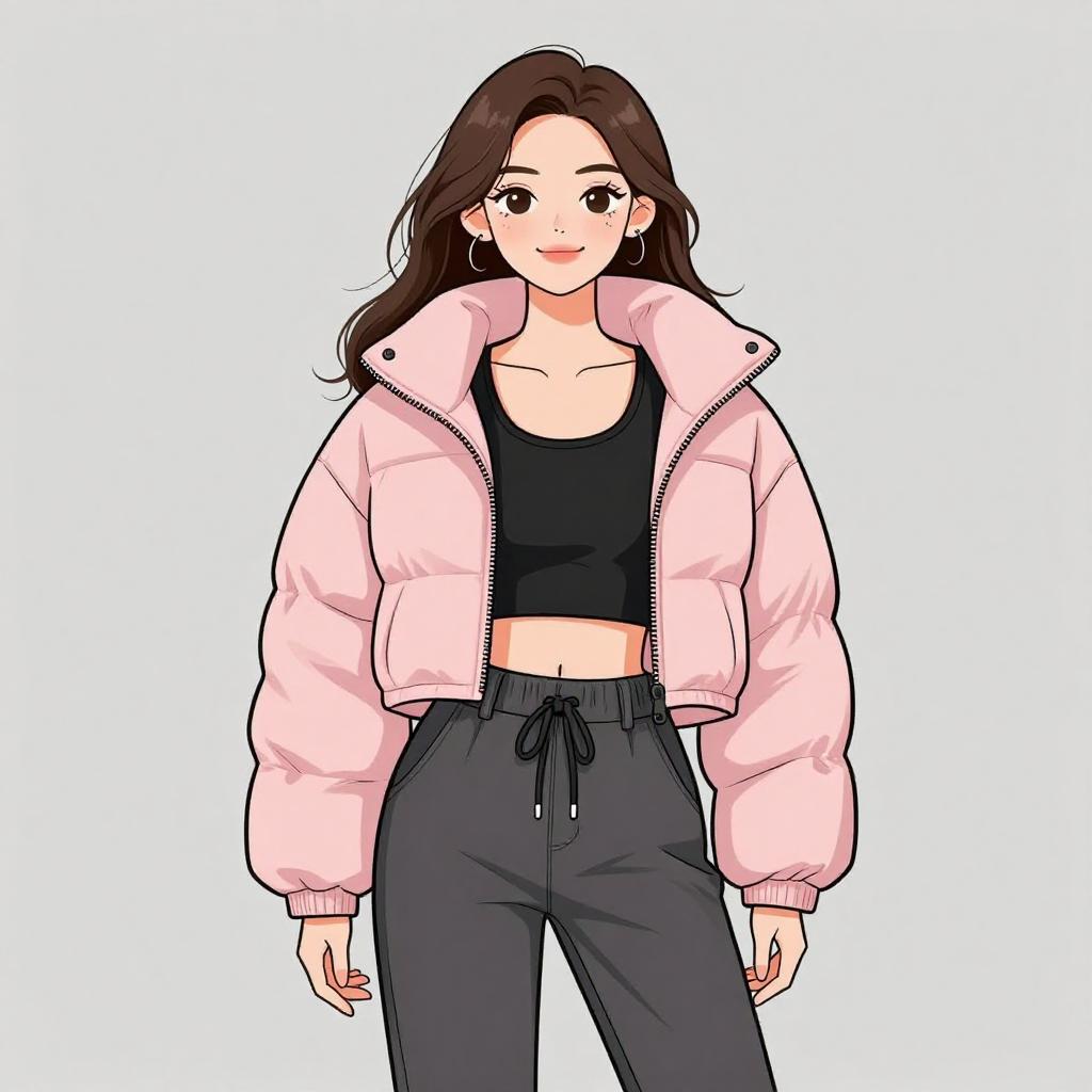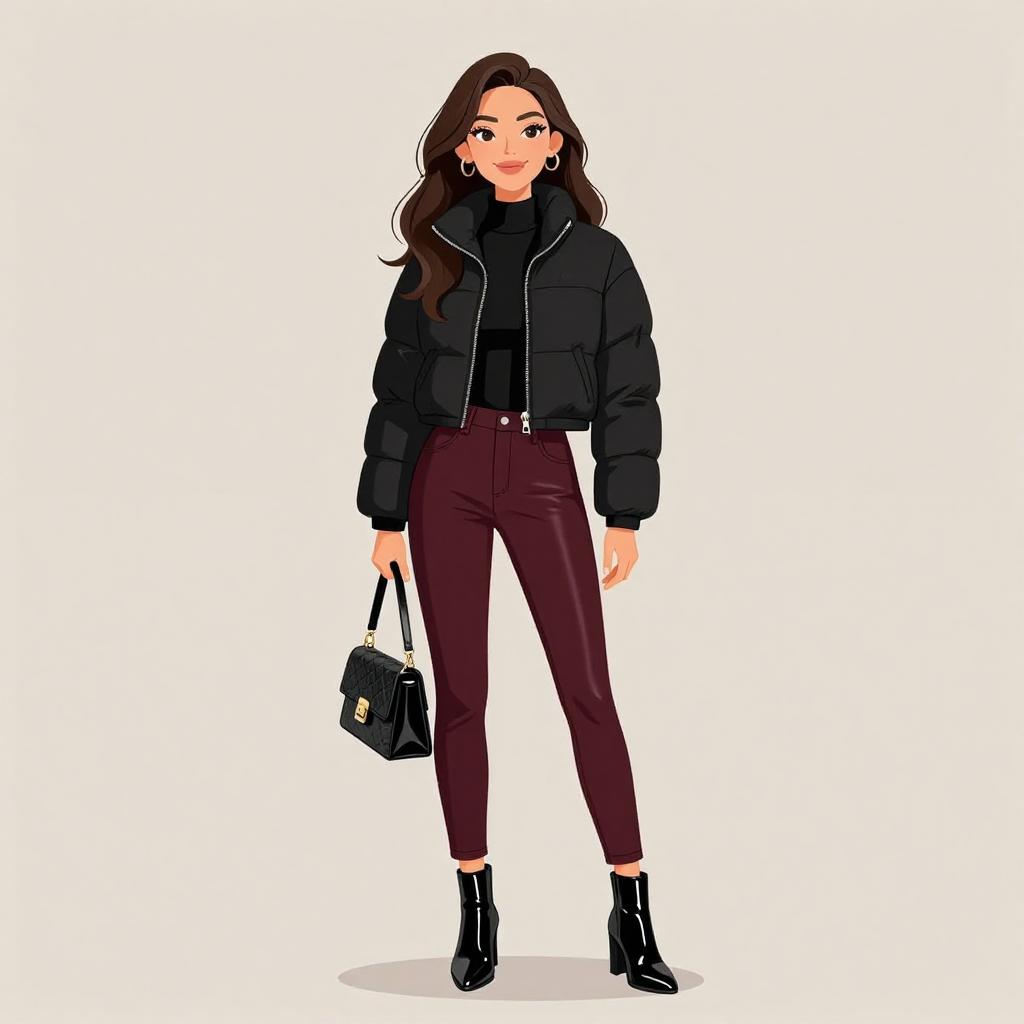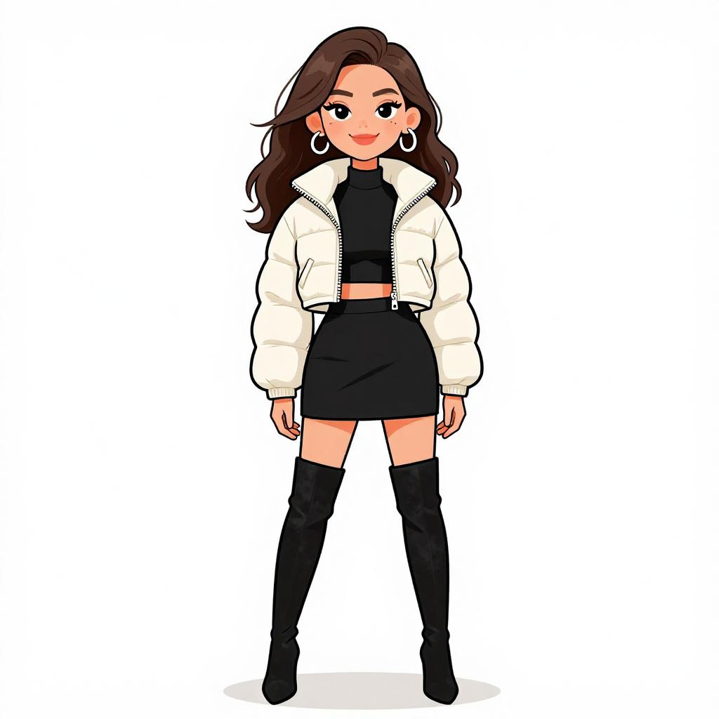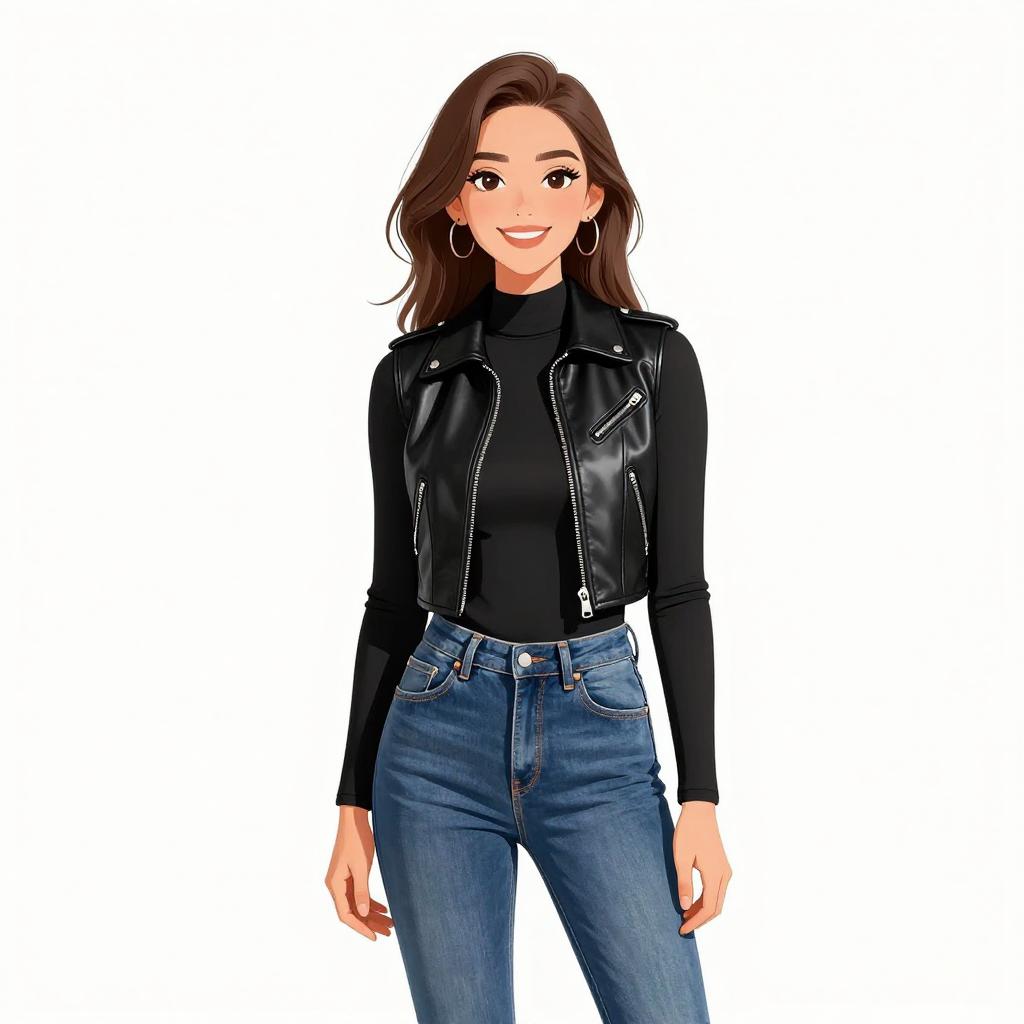 Woman with pretty face and pretty hair. smiling Woman, urban chic, oversized faux fur coat in a soft gray, leather detailing, asymmetrical front zipper, side pockets with zippers, black inner lining, knee-length, black mini dress underneath, minimal visible, finish at mid-thigh, black leather gloves, neutral studio background --sref 1467