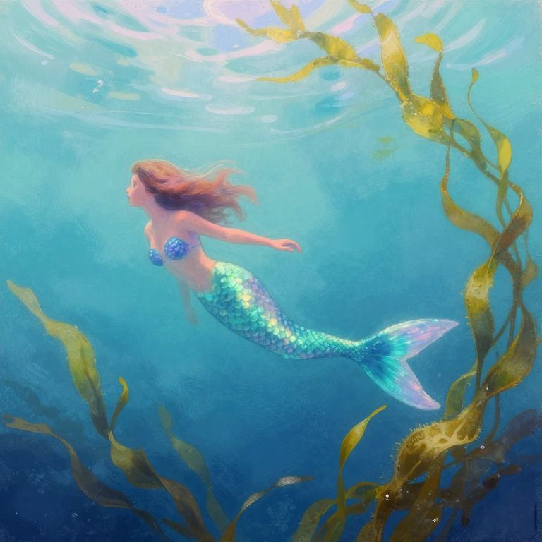 Imagine a captivating digital painting in photorealistic style depicting an alluring mermaid princess with shimmering scales gracefully navigating through an enchanting underwater kelp forest. From a distinctive aerial perspective akin to a 'flying fish's-eye view', observe her ethereal allure as she intertwines between the swaying green foliage, illuminating dappled sunlight filtering from above onto her face and surrounding aquatic flora. Her captivating melody resonates through the water, invoking a sense of awe and melancholy that reverberates throughout this magical underwater kingdom.