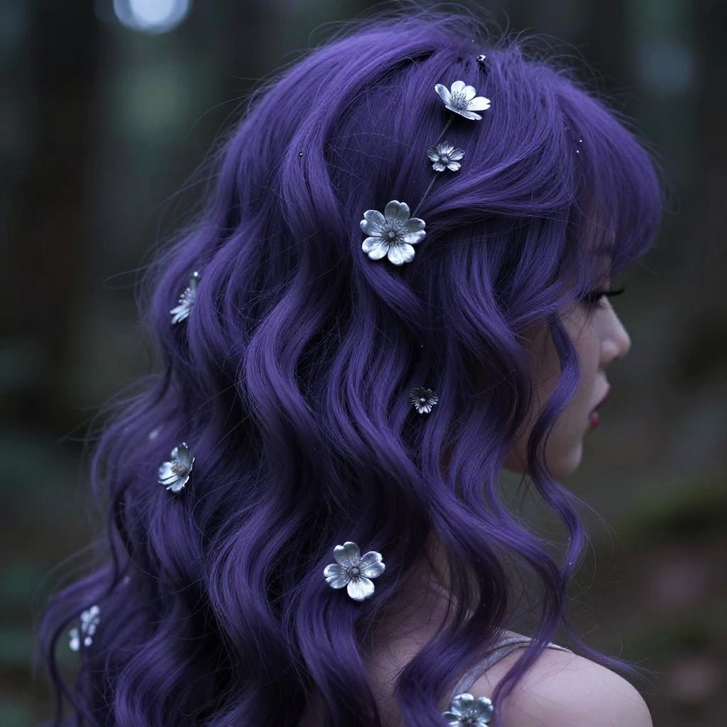Close-up of wavy purple hair intertwined with delicate silver flowers, mystical forest setting, soft ambient light, ethereal atmosphere, high resolution with intricate hair texture