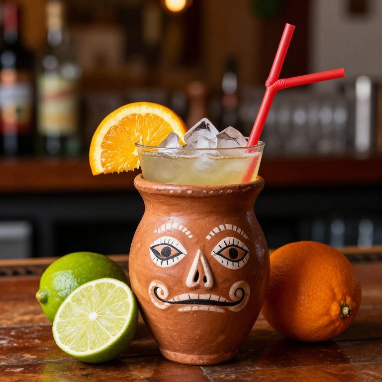 Cantarito cocktail served in traditional clay cup, vibrant mix of citrus fruits and ice, rustic Mexican bar background, warm ambient lighting, colorful and refreshing summer drink presentation with lime, orange, and red straw