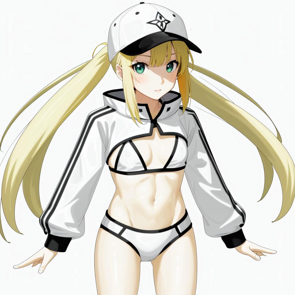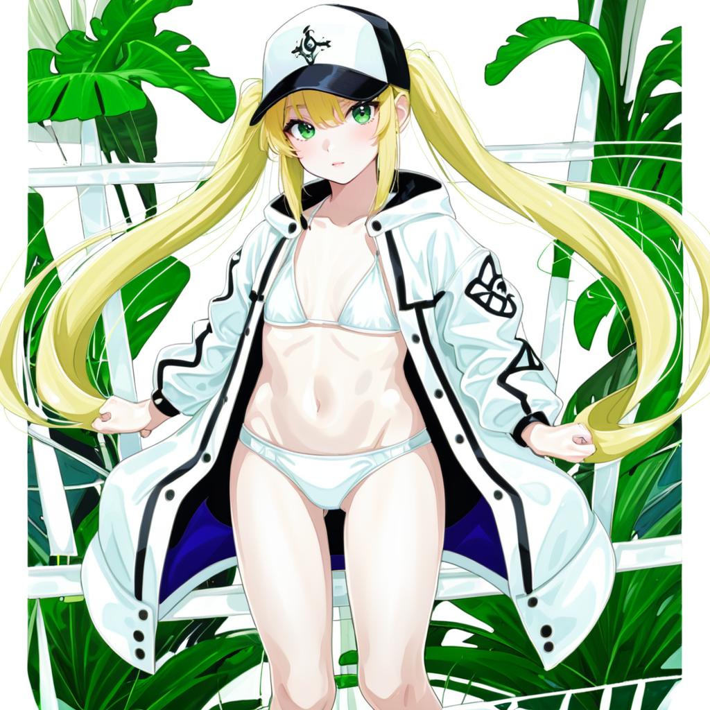 Artoria caster (swimsuit) (first ascension) (fate), fate (series), 1girl, green eyes, blonde hair, long hair, twintails, medium breasts, small breasts, thighs, navel, white bikini, baseball cap, white jacket, shrug (clothing), white headwear, cropped jacket, black pants, long sleeves, single pantsleg, white hat, by artist erkaz, illustrious