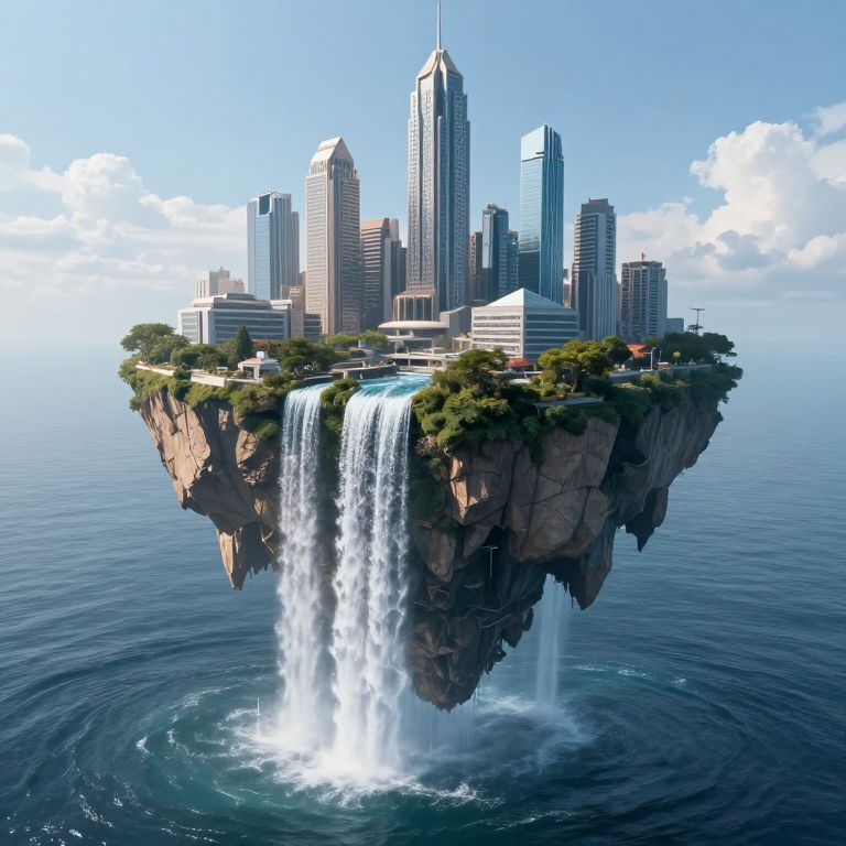 Photorealistic CGI of a floating city with tall skyscrapers, lush greenery, and a large waterfall cascading into the ocean below.