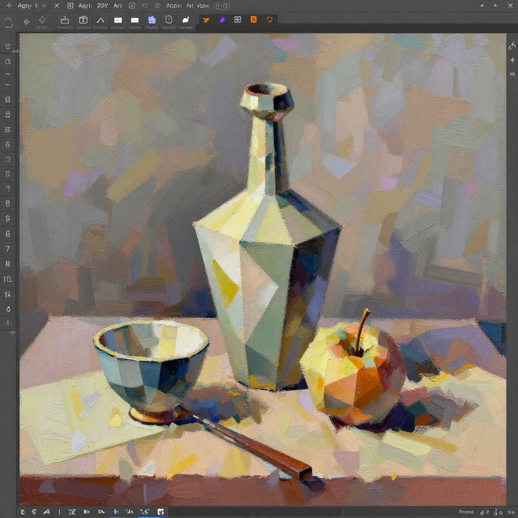 Ai art editor from photo converting a simple still life image into a cubist-inspired artwork, with fractured shapes, angular forms, and muted pastel colors, showcasing the algorithm's ability to reinterpret traditional compositions, textured brush effects