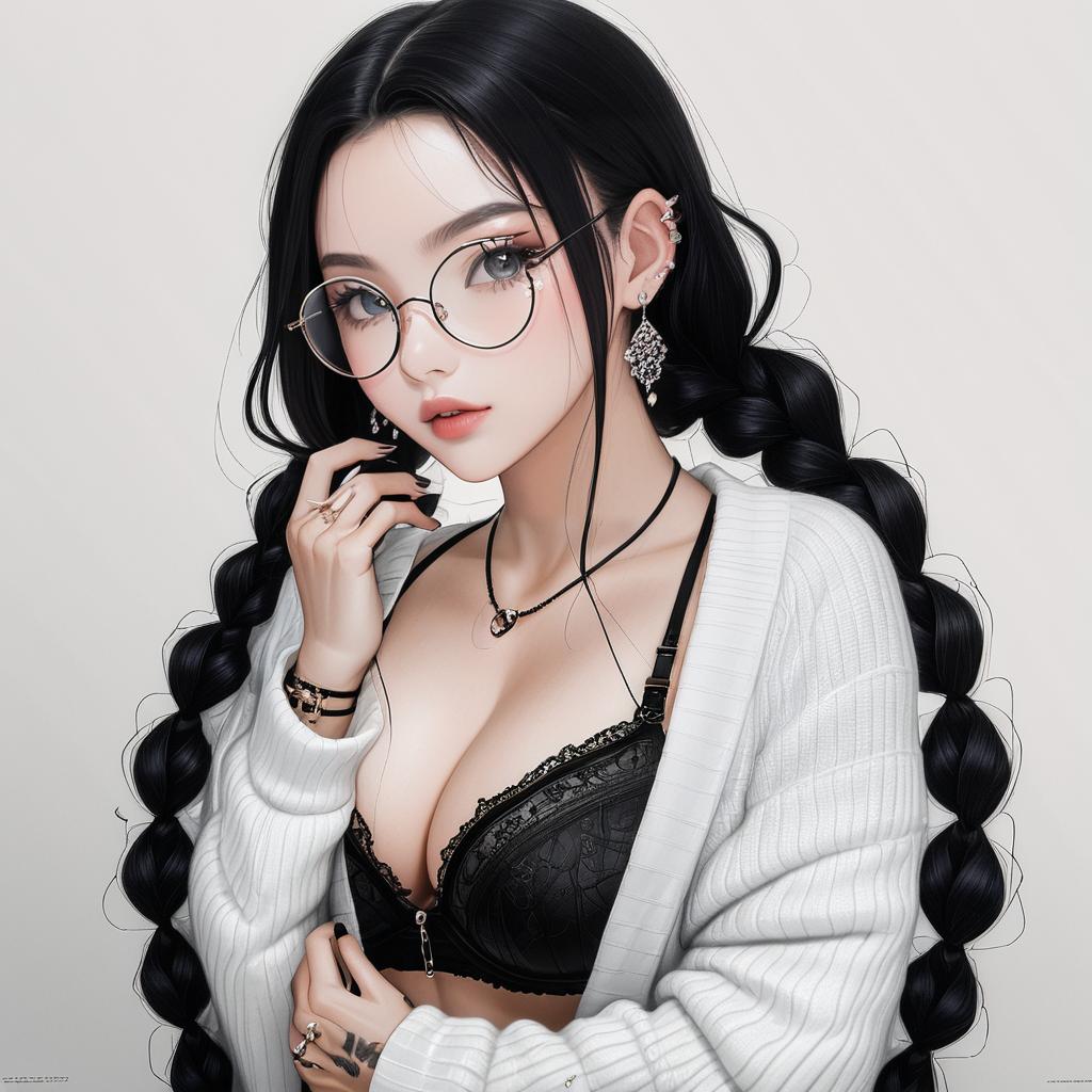 1girl, jewelry, earrings, solo, black hair, braid, long hair, looking at viewer, choker, hair ornament, brown eyes, necklace, realistic, lips, simple background, grey background, portrait, upper body, piercing, closed mouth, eyelashes, black choker, collarbone, makeup, bow