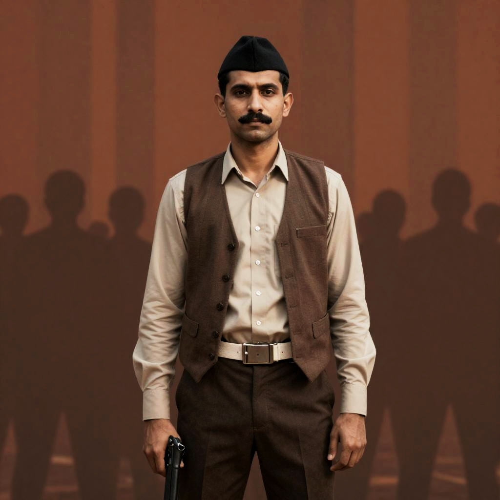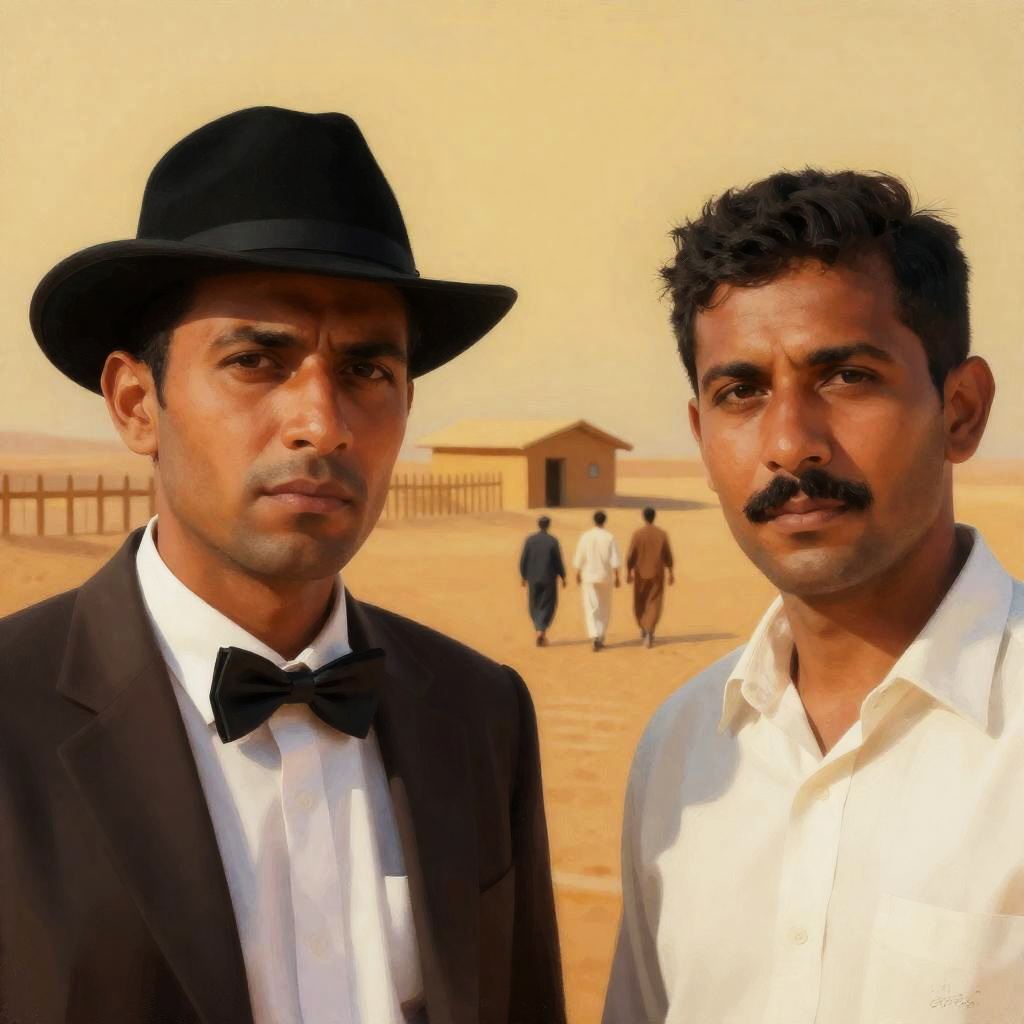 Painted image. Two men in the foreground, one with a black hat and bowtie, other with mustache and white shirt. Background: desert landscape, wooden fence, small building, four people walking. Warm yellow and orange hues. Both men's faces serious.