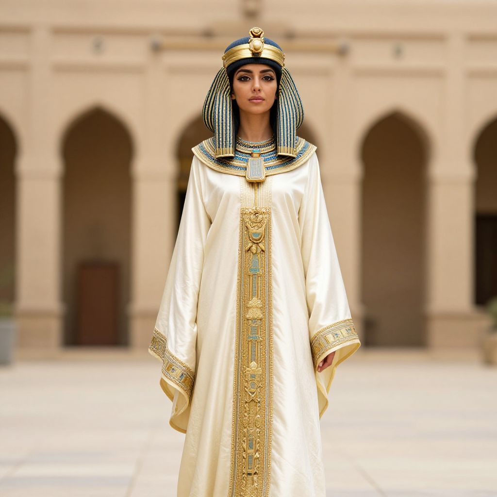 Photograph of a woman in an ancient Egyptian headdress and white, gold-embroidered robe, standing in front of a beige, arched
