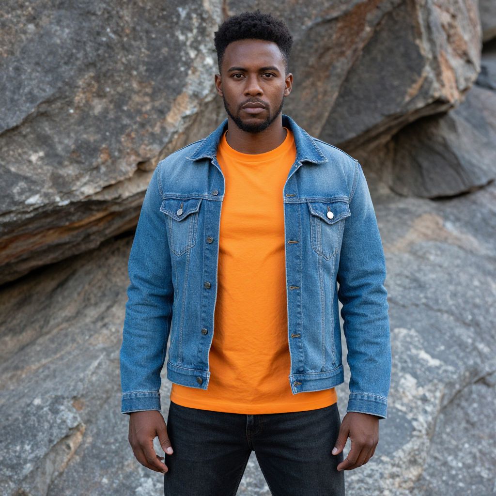 Rock Clothing Costume, man in a blue jacket and orange shirt standing in front of a rocky area
