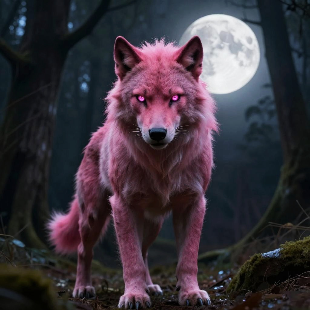 Pink werewolf standing under a full moon in a mystical forest, glowing eyes, fierce expression, detailed fur texture, cinematic lighting, fantasy art style