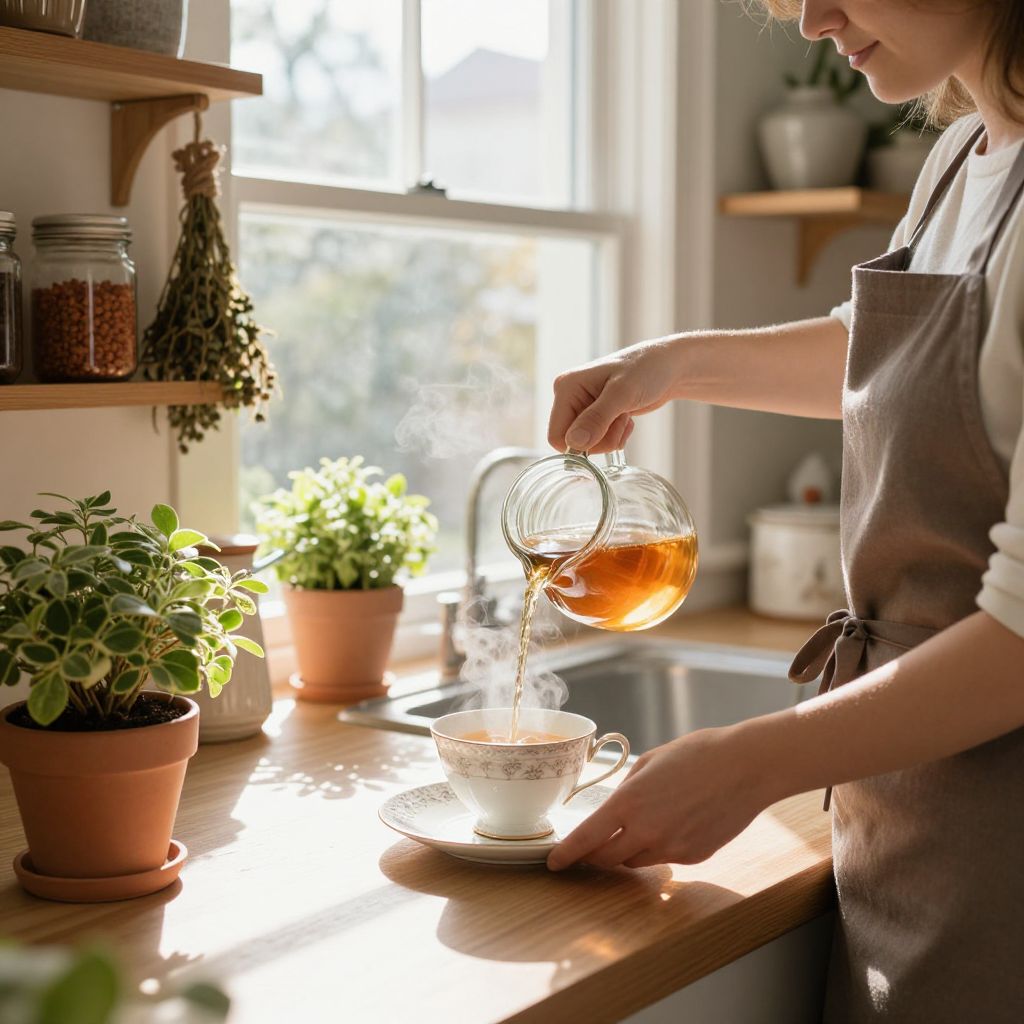 Warm sunlight streams through a large window as a woman in a brown apron carefully pours steaming tea from a glass jar into a delicate white teacup, surrounded by a cozy kitchen scene featuring potted plants, hanging herbs, and shelves lined with colorful jars and ceramic containers.