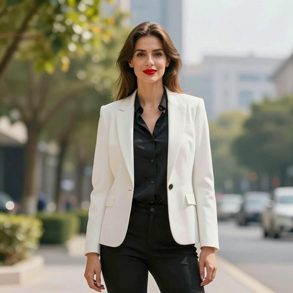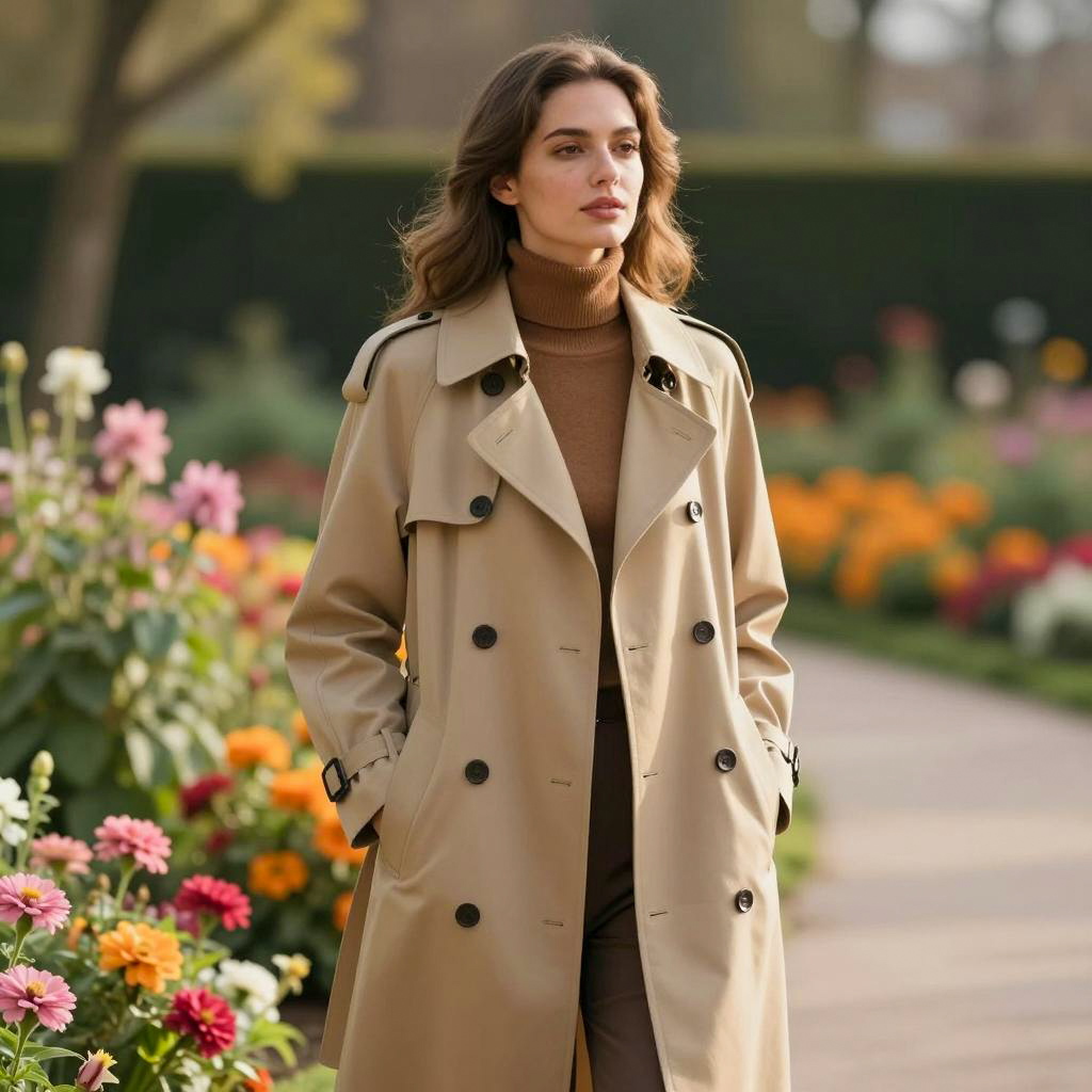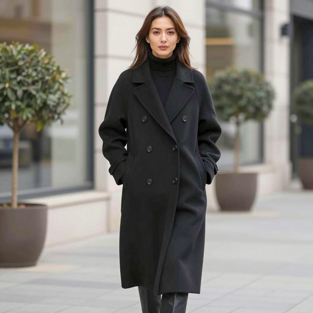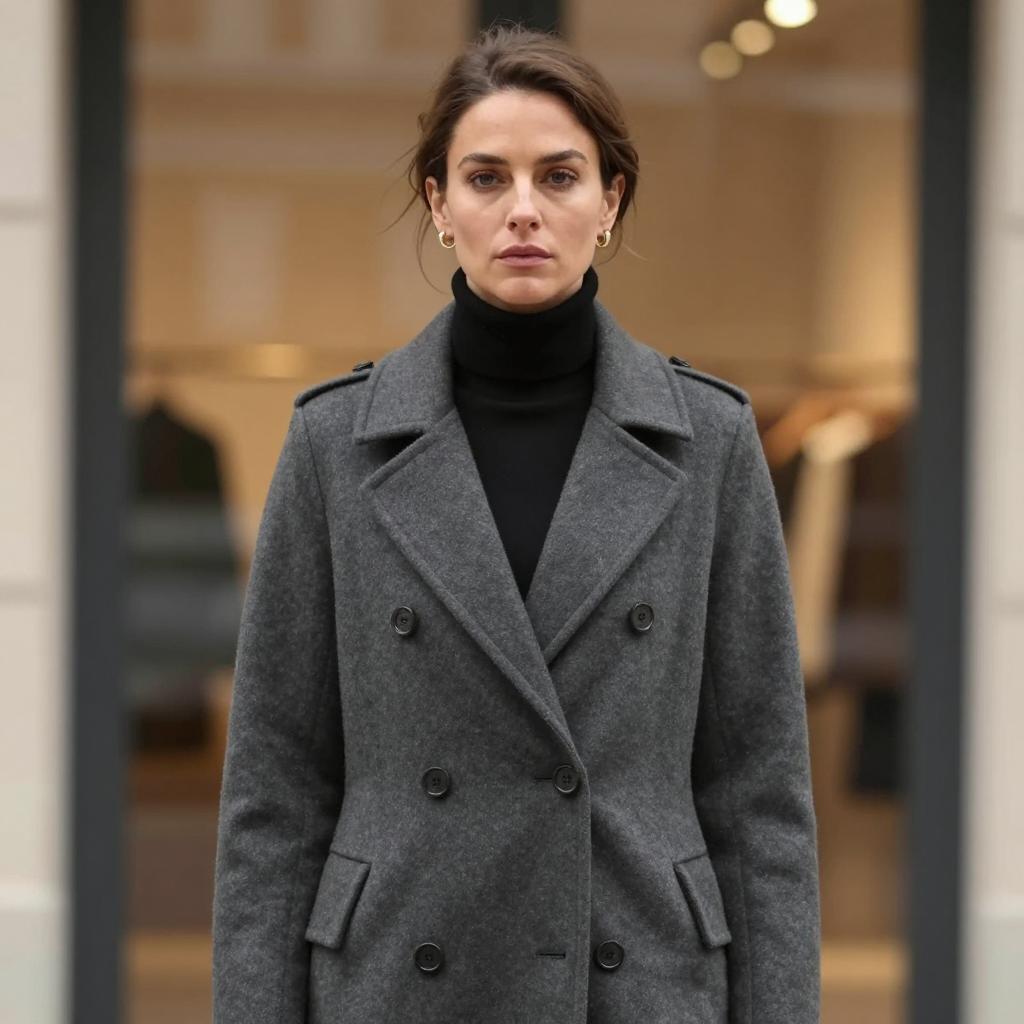 Black wool coat, photograph of a woman, full body, standing outdoors, wearing black double-breasted coat, black turtleneck, hands in coat pockets, medium-length brown hair, neutral expression, background with large windows, potted plants, overcast lighting, street setting, realistic, modern fashion, slightly blurry background