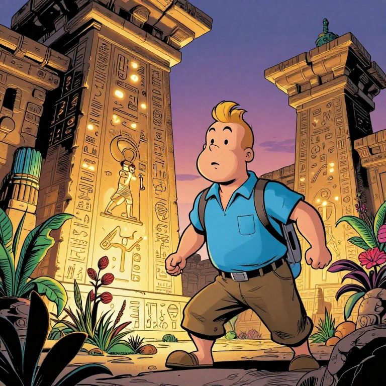 Tintins in a vibrant comic book style, adventurous young reporter with a quiff hairstyle exploring a mysterious ancient temple filled with glowing hieroglyphs and exotic plants under a twilight sky, dynamic perspective, rich colors, detailed line art